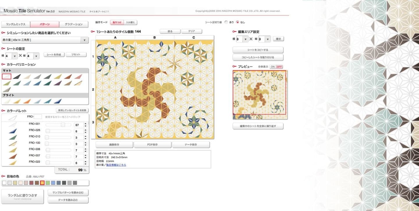 正方形だけでなく、丸形・六角形・ボーダー、「麻の葉」や「コラベル」など異形のタイルまで、ゲーム感覚で愉しみながら簡単にオリジナルデザインを作成することができる便利なツールです。[ランダムミックス][パターン][グラデーション]の3種類のメニューがあり、描画範囲は最大10×10シート。特別なソフトのインストールや会員登録は不要です。是非ご活用ください。