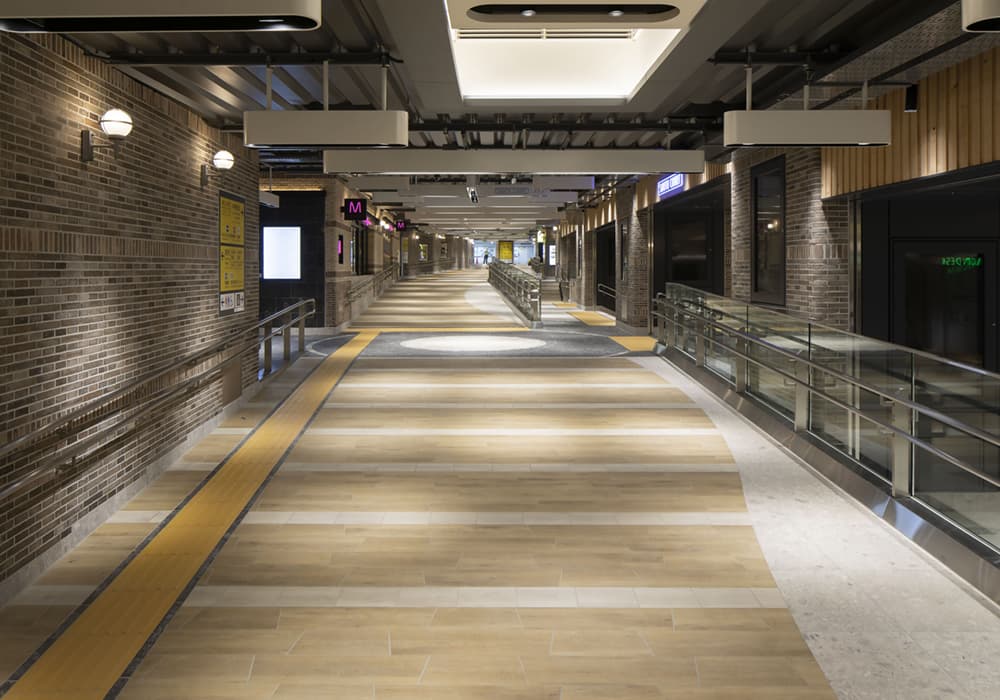近年、厚みのあるタイルを実用的に使用した例として、JR 横浜駅構内のスロープ通路が挙げられます。スムーズな旅客流動のために、スロープの通路が設置され、20mm厚のセラミックタイルが張られています。このスロープは 1/12の勾配で、始まりから終わりまでの高さ差は約3.5mに達します。下から上がる人にとってはスロープが壁のように見えることがあるため、圧迫感を与えないように、明るい色のタイルが使われています。またスロープ 通路の途中にはフラットな踊り場があり、濃い色の天然石調タイルを配置しています。利用者が スロープの変化を色差によって視覚的に認識しやすいように、タイルの素材感を薄くナチュラルに仕上げています。勾配のメインに使用されている木目調のタイルは1200×200mmの横張りで、足のサイズに合わせて目地が入るようにデザインされています。タイルの一部には斜めカットの形状が施されており、デザイン性も高められています。このように、横浜駅のスロープ通路には、バリアフリーの観点からとデザインの観点からも工夫が凝らされています。
