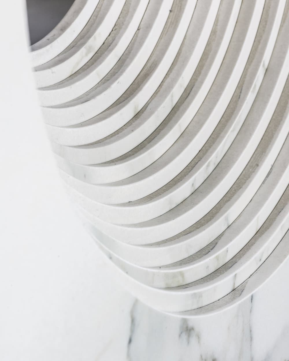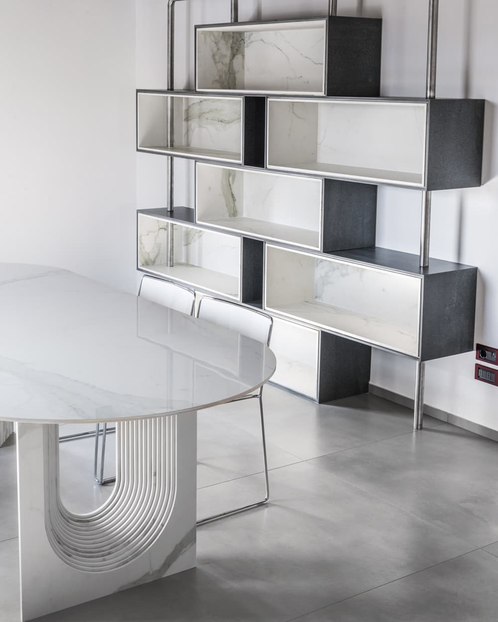 一方で、ラミナムの商標で知られるシステムセラミック社は2001年設立(現在はCoesia Group)の比較的新しい会社で、タイル産業の集積地である「フィオラノモデネーゼ(イタリア・モデナ)」にあり、フェラーリの工場があるマラネッロと隣接しています。その影響かどうかはわかりませんが、後発ながらもシステムセラミック社は革命的なキャタピラベルト式のプレスを生み出しました。2002年世界初の超大判技術により最大寸法4,800×1,600mm、厚さ3mmから30mmまで生産可能な設備ができました。特に驚くべくことは、形状別に必要であった金型がいらなくなり、プレス圧は17,000トン(最大サイズ2,400×1,200mm)から25,000トン(最大サイズ3,600×1,200mm)と従来の数倍から10倍の圧力で巨大なタイルを製造することが可能になったことです。開発当初、製品は3,000×1,000mm、厚さ3mmで、柔軟性が低く折れやすいものでした。イタリアの大手タイルメーカーは、イモラサクミ社の従来型のプレスに慣れていたため、はじめは導入に懐疑的でしたが、一社、また一社と設備を導入しました。今では世界各国にプラント輸出されています。さらに、後年にはサクミイモラ社もシステムセラミック社と同様な方式の設備を開発して、新旧の2大設備メーカーとして開発競争が続いています。 最近の生産設備の進化ではシステムセラミック社が「スルーヴェイン(積層模様)」と呼ばれる新しい装飾技術を開発しました。この技術は、自然界の天然石であれば沈殿物の集積により数百万年かけて形成されるプロセスを、わずか数分の工程で、セラミック内部にリアルな模様や質感を作り出します。この技術は「ジェネシス」と名付けられ、 3Dデジタル制御システムを用いて、特定の場所に粘土の色粉を正確に放出し、望んだデザインを実現することができます。 この技術の進歩によって、セラミックのスラブ材の製造分野では、美しさと機能性を組み合わせた新たな可能性が 開かれました。これらは質感、強度、耐久性に優れており、その多様性から家具やデザイン業界での利用が広がっています。特に、「ジェネシス」システムは、高速プレス機とデジタルプリンターを統合したハイブリッドシステムを採用しています。このシステムでは生産ラインにおける製品の移動がないと同時に、迅速に反応する粉末プリントヘッドによって、大理石や天然石の高級な見た目を忠実に再現しながら、生産スピードと技術的品質を両立させています。