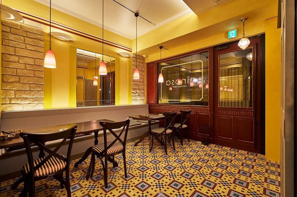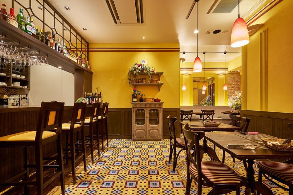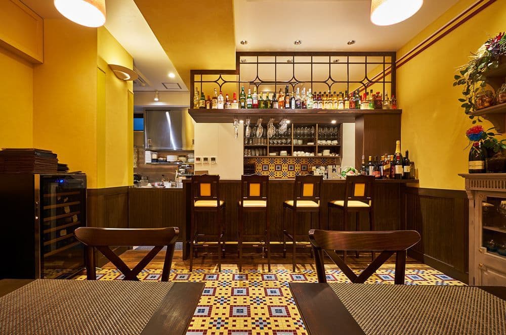 25角のモザイクタイルのパターン貼りでカジュアルな店の雰囲気を演出しつつウォルナットの建具や家具で空間を引き締めた。 モザイクパターンはオーナーがイタリアで訪れたトラットリアの雰囲気を再現する為、「アートモザイク施釉25角」からカラーを4色選定し、1色はマット調の黄色を入れて再現をした。