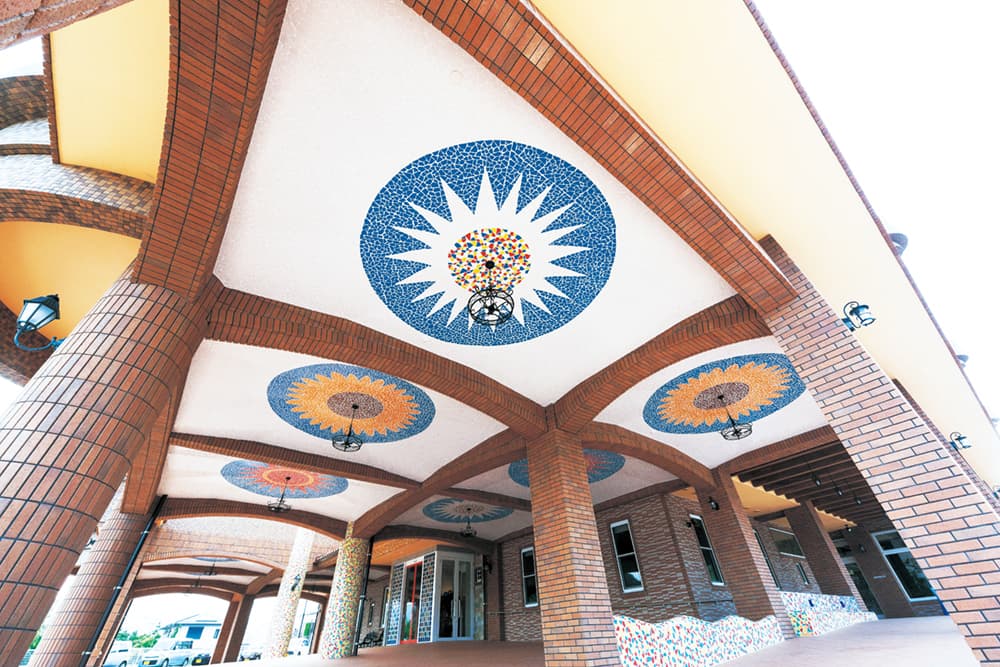 施設の入り口・玄関ピロテイーの天井に希望の光として太陽の光、ひまわりそして心(希望)の光、3種類を計12個左右対称に配置した。暖かい施設・明るい時間へのいざないとして。 太陽、ひまわりは少しアクセントを付け、心は白青黄赤の4色張りで混沌さを円で表した。きれいな光になった。4本の柱を1階玄関から2本、中央ホール2階から2本、屋上から5m、地上約15mまで延ばし、希望の塔とし、建物の象徴とした。希望、生きる力を感じてもらえたらと。頂部球(40cm)は、赤…太陽、緑…森、青…水を示している。塔はエンタシスで美しさを出した。施主案の壁画、ボールト天井(希望の光)、長い尾のドラゴンなどは全て喫茶室そして暖かい施設へのいざない。周囲ボーダータイルも名古屋モザイクに特注した。