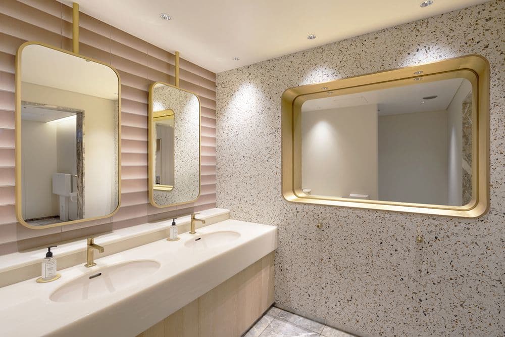大阪西梅田、ラグジュアリー向け商業施設のハービスプラザに 「大人のオトコの遊び心」をコンセプトとした男性向けドレッシングルームをデザイン。 身なりを整えるパウダーコーナー、くつろぎのあるラウンジ、フィッティングルームを有し、自由に利用できる高感度なケア用品や香水も揃えた。洗面前にはいちょう柄のタイルを配し空間のポイントとした。和の質感も持ち合わせたこのタイルは空間に安心感と深みを与えてくれ、ホテルでも商業施設でも見ないラグジュアリーなレストルーム空間となった。また女性トイレにはブラインドから光が差し込んだかの様に見えるタイルを洗面前に配置。窓辺で身なりを整えるような爽やかな空間になった。