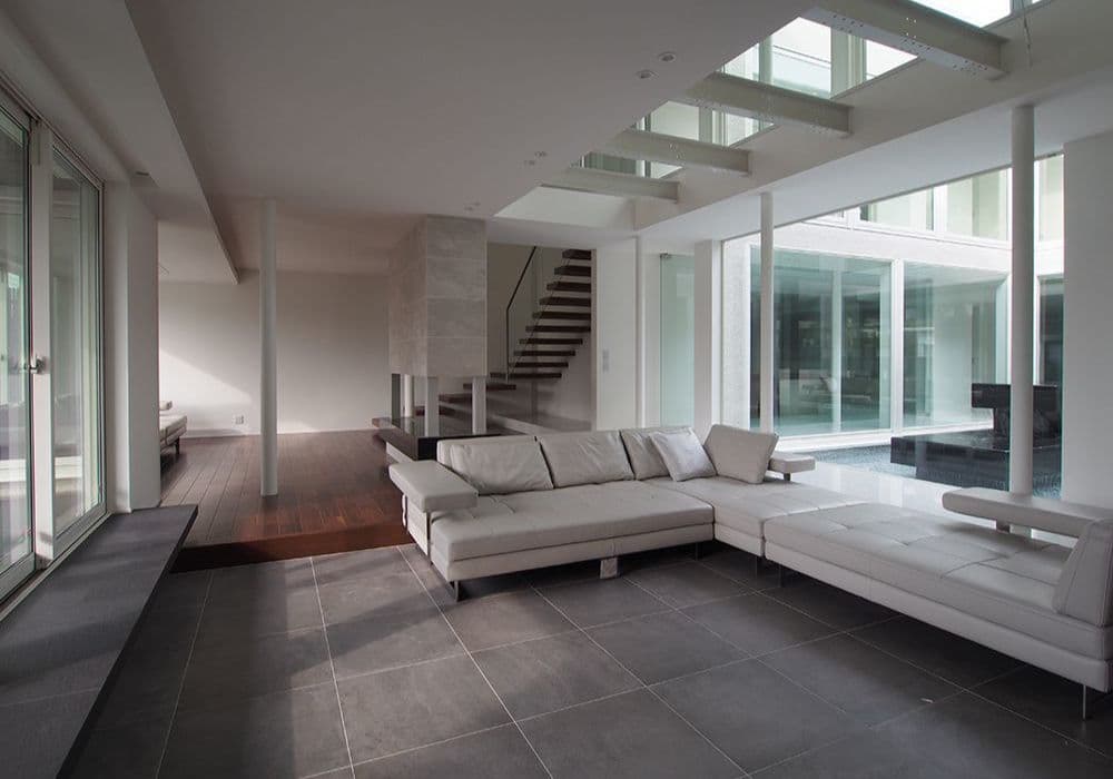 施主は仕事で世界中を飛び回る敏腕社長ですが、家に戻ってもゲストを迎え入れることが多いため、2階の半分以上はゲストルームです。ゲストを迎え入れるうえで、生活感をあまり出さずに海外のリゾートを訪れたような印象を目指し、モノトーンとアースカラーをベースにすっきりとした空間を創り上げました。本物の素材に拘り、タイル・木・ガラス・和紙等、それぞれ高品質なものを選んでいます。解放感を持たせるため、中庭と家を一つの建築物として連動性を持たせる構造にしました。また、奥様のお部屋だけは、女性らしい温かみのあるテイストにし、独立した一部屋としました。夫妻ともに、度々名古屋モザイク工業のショールームに足を運び、お気に入りを選んで頂きました。