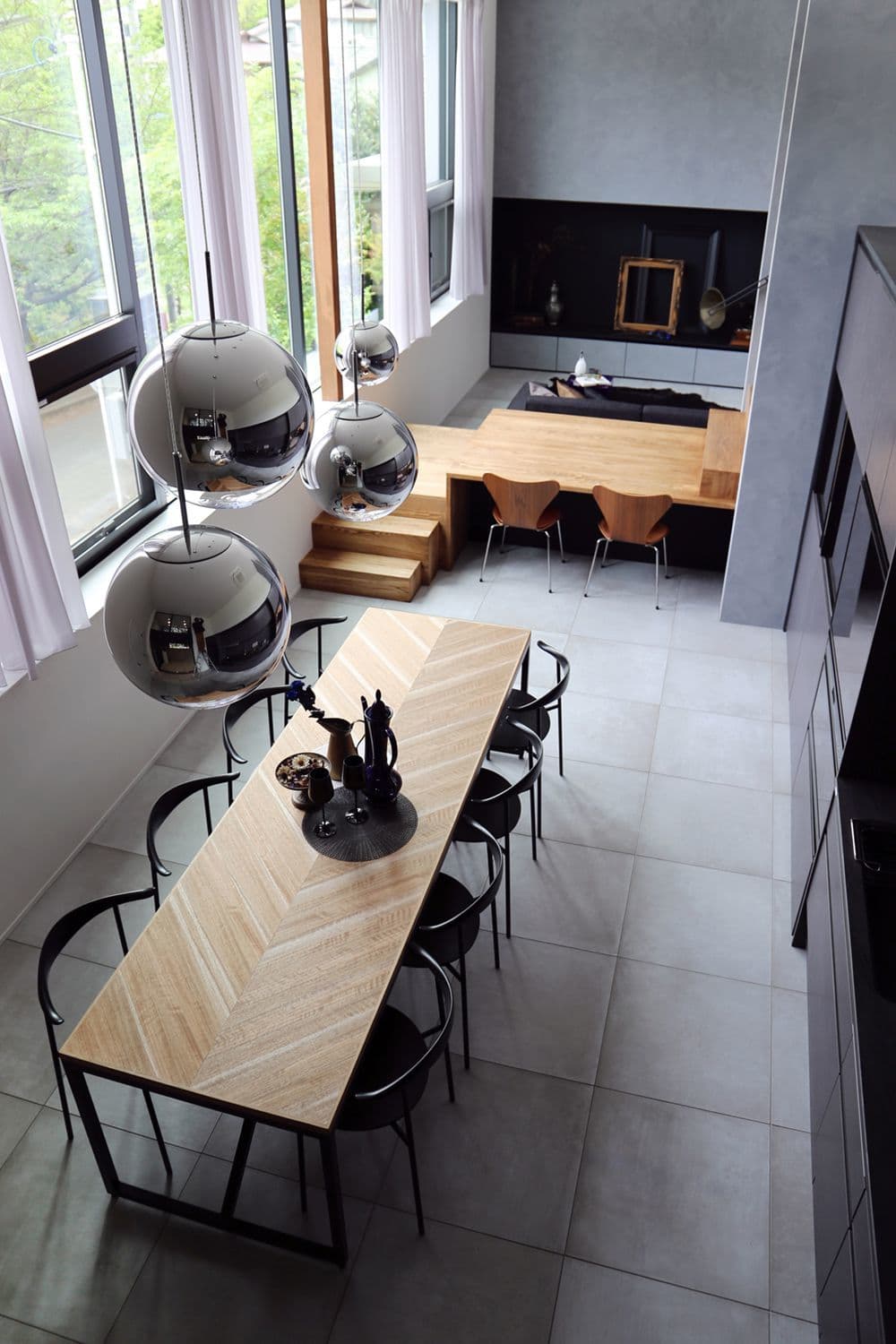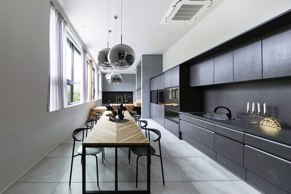 敷地内の高低差が6mある傾斜地の形状を活かして1階床レベルを2層に設計し、天井ラインを合わせることで天井高3.8mのダイナミックなLDK空間を実現した。また高低差により道路面からの視線を排除し、プライバシー性の高い空間を実現させた。LDKのスケール感に合うように家具や照明のインテリア要素を大きくしてバランスを取り、全体を素材感のあるグレー色の塗り壁やタイルでコーディネートした。LDKから続く屋外テラスの床タイルを統一し、屋内と屋外の境界を曖昧にしながら広がりを持たせた。また、2階の浴室から続く脱衣室はフィジカルメンテナンスの場所として5帖のスペースを確保し、床のタイルでデザイン性を高めている。