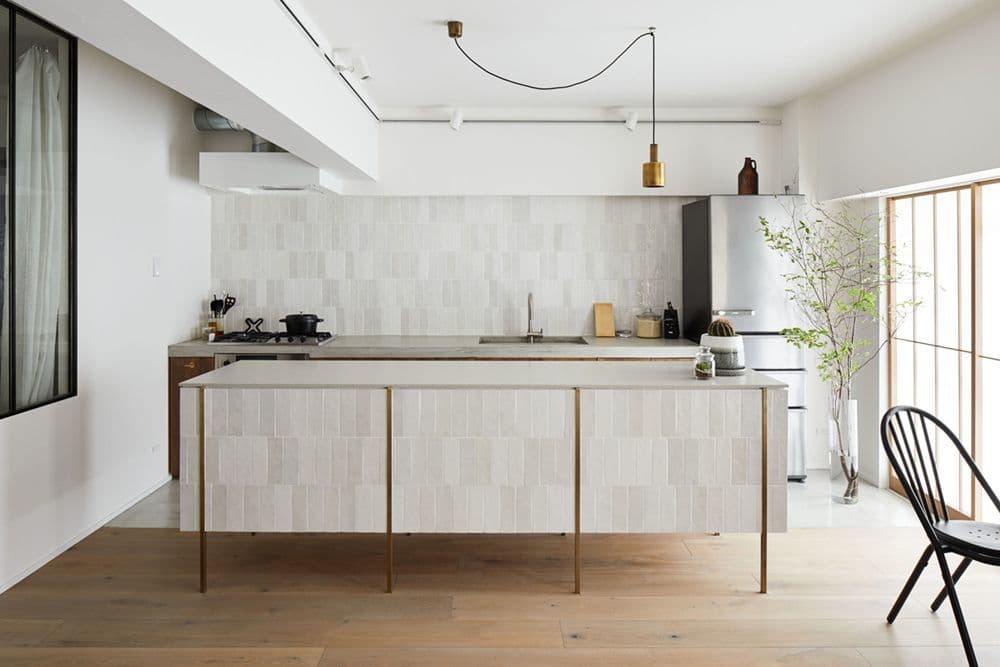 本案件は、マンションのリノベーションです。 お施主様は週末に一週間分の常備菜の作り置きをするのが日課です。 その為、広めのワークスペースを確保したいとのご要望を酌み、ご提案したキッチン。 LDK の広さに対してキッチンのボリュームが圧迫感を感じさせないよう、白の色ムラが美しいタイルを採用し、壁面とアイランド什器に施しました。 貼り方も美しさがより引き立つ様、縦貼りとし、真鍮のライン(脚)でキッチンを浮かすことで、より軽やかで女性らしい印象に仕上げました。