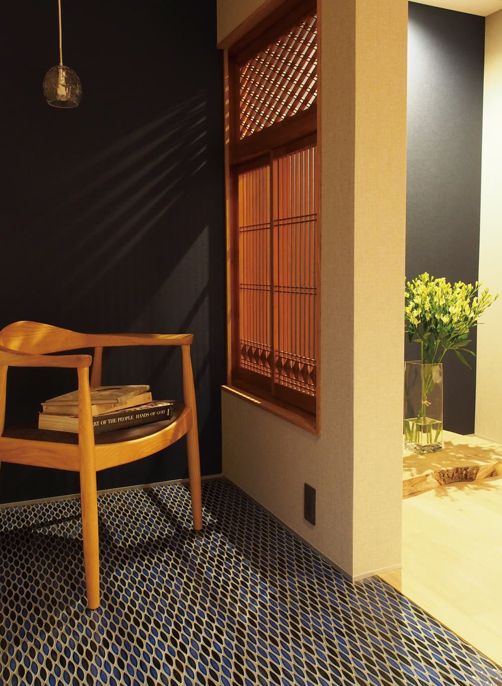 施主のおじい様が建てた築80年の民家をリノベーションした計画です。ダイニングキッチンと和室3部屋を大きなワンルームにして、縁側も部屋の一部として楽しめる様にしました。その南側の縁側スペースに印象的な青いタイルを敷き詰め、ひと続きの空間でありながらも時間の流れが違う様な特別空間に。読書をしたり、朝ごはんを食べたり、窓を開いてバーベキュー空間になったりと家族が集まる空間ができました。冬には太陽の光によってタイルが蓄熱し、暖かくなり、夏には庇によって太陽光が届かない様にしたので、ヒンヤリ涼しい気持ちの良い場所です。昔ながらのパッシブデザインをより積極的に機能する様にタイルを取り入れました。