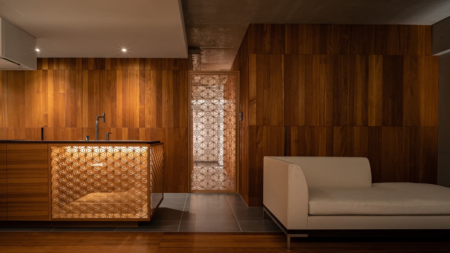 京都市内の築20年になるマンションの1室。経年による設備の劣化とライフスタイルの変化を契機にスケルトンリノベーションを計画した。友人を招いてのホームパーティや趣味の洋裁を楽しむための居心地の良い空間を目指し、「和」を取り入れながらも既存家具が映える、モダンな雰囲気のデザインとしている。繊細な組子と調和するよう模様と色合いに特色のあるタイルを組み合わせ、畳や敷居との取り合いにも配慮した。木の有機的に表現される賑わいと、タイルやコンクリートによる無機的な静寂との相反性が、不思議とこの場に「和み」を与えている。