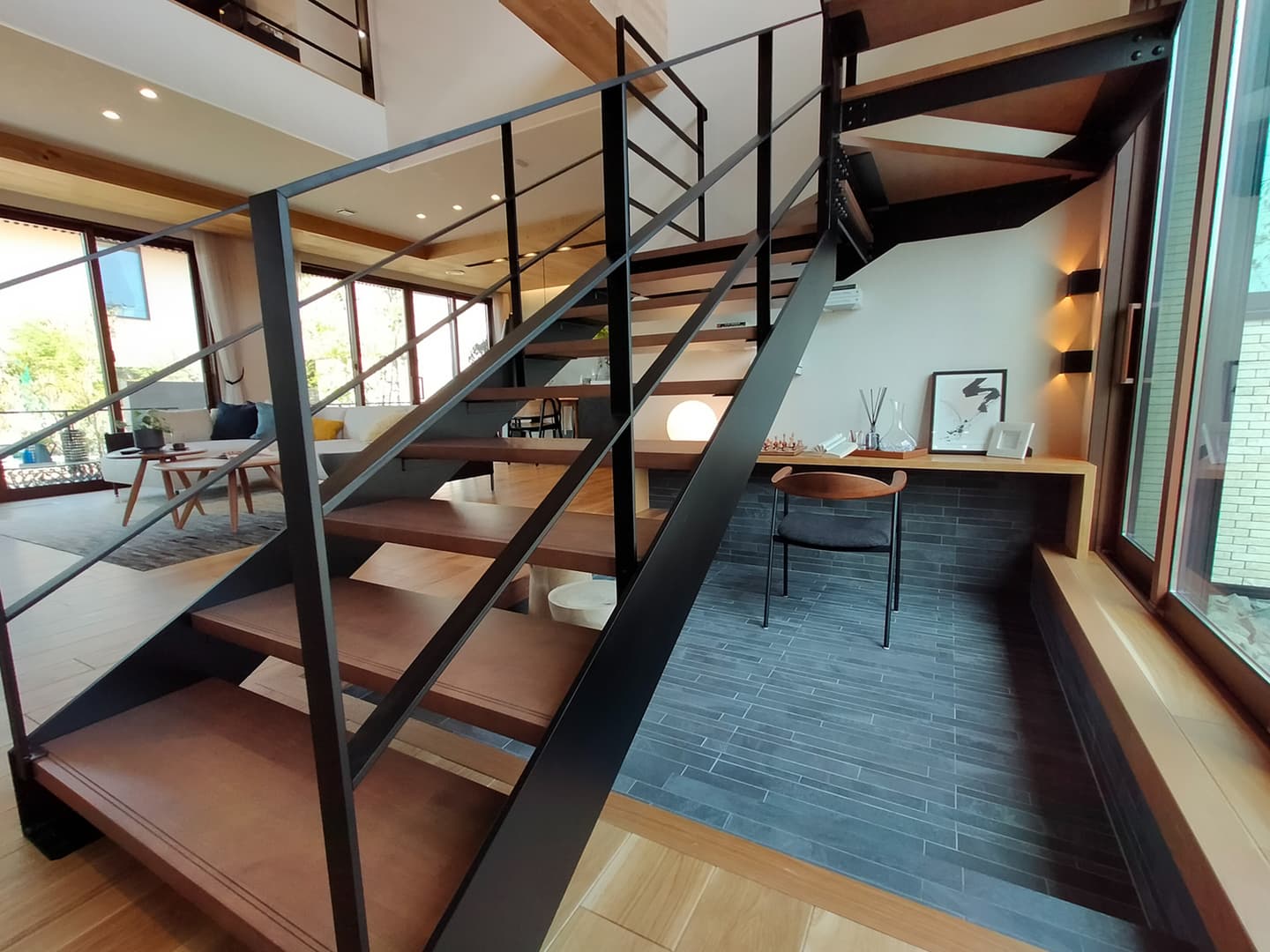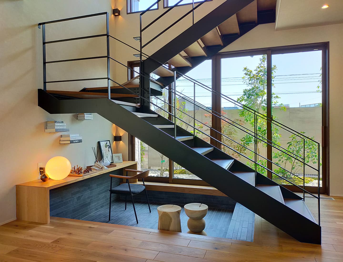 大空間の中にあるデッドスペースとなりがちな小空間(スケルトン階段下)。スケルトン階段の普及に伴い、そのような小空間を大空間に変化を与える素敵な空間にしたいと考えました。リズム感のある「デンバーストン」を掘り下げた床だけでなく、連続して壁まで立ち上げ造作のカウンターでとめる事で小空間を広く見せると共に大空間の平面的・立体的なアクセント空間となるよう考えました。アプローチからメインデッキは踏板と蹴込板のタイル・カラーを変える事で浮遊感のあるデザインとすると共にリズムのある空間構成とすることでご家族様にとってのON・OFFの気持ちの切りかえ(変化)ができ、リラックスできる空間となるよう考えました。
