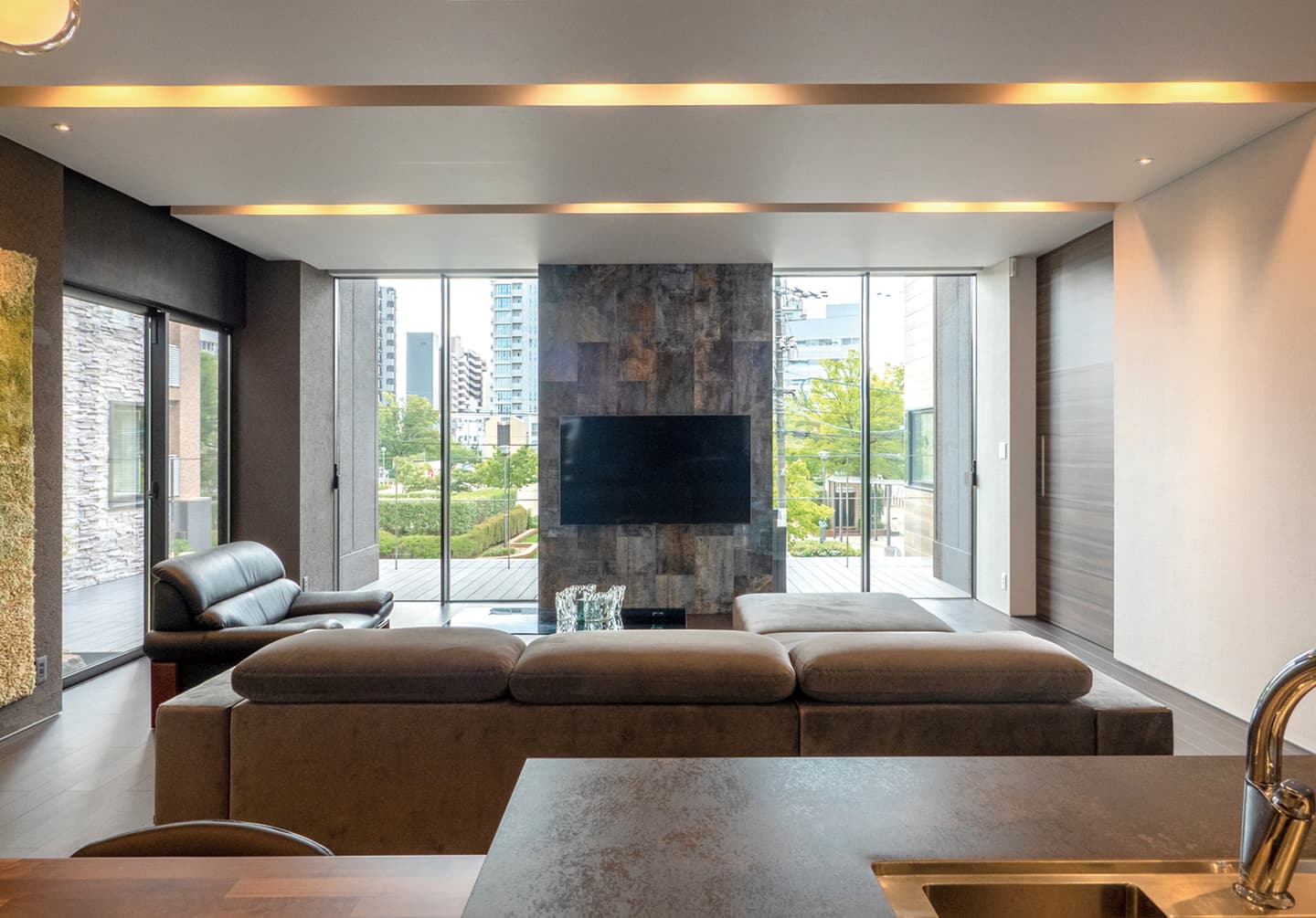 商業ビル等が立ち並ぶ街中の一角、地元住民に愛される公園に面する立地のクリニック併用住宅である。施主は、景観に溶け込む自然をイメージした建物を希望していた。施主の要望に応えるべく、外壁は木目調のタイルや、自然石をイメージするタイルを使用し、内部の床にも石目のタイルを使用した。街中の一角であるが、自然を感じさせる空間に仕上げる事ができた。住宅部分において、リビングルームの正面に位置する印象的な壁には、施主の趣味である渓流釣りの風景を連想させる滝のイメージをタイルにて表現した。
