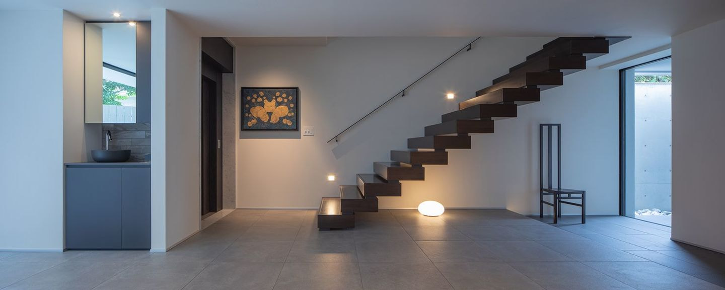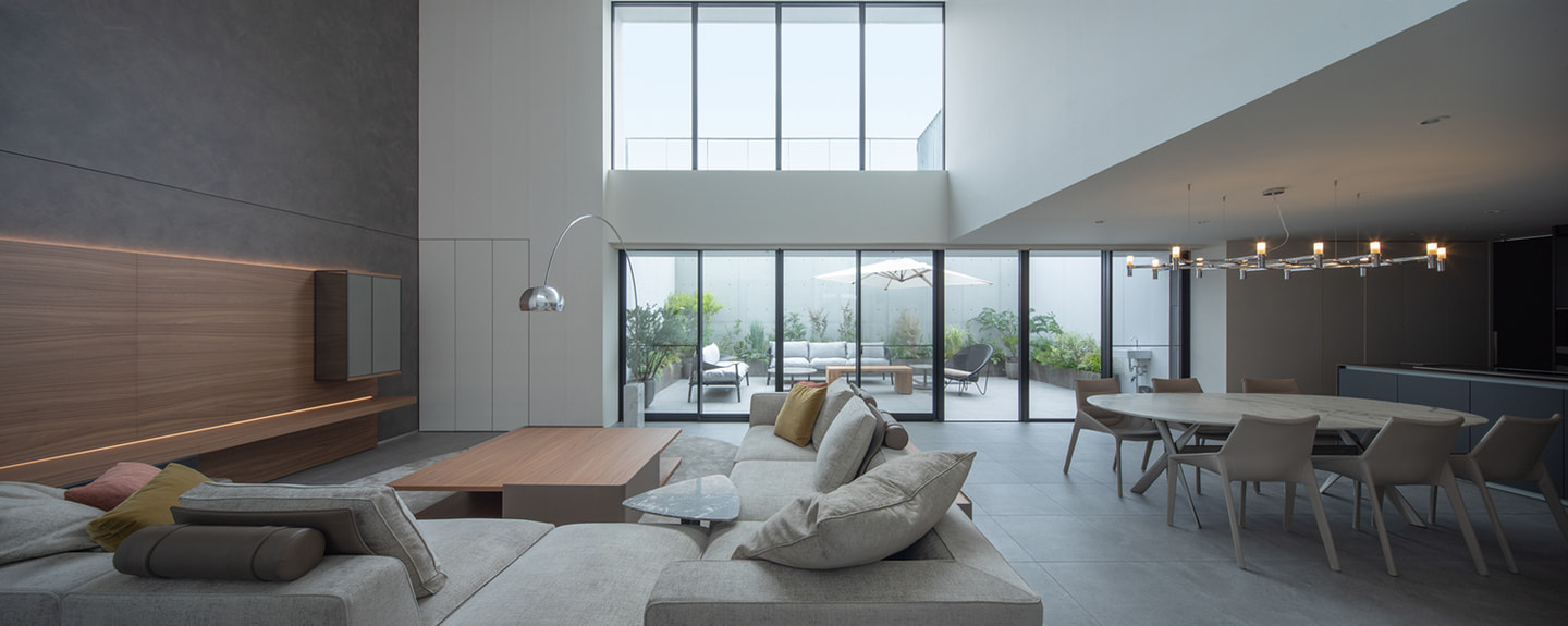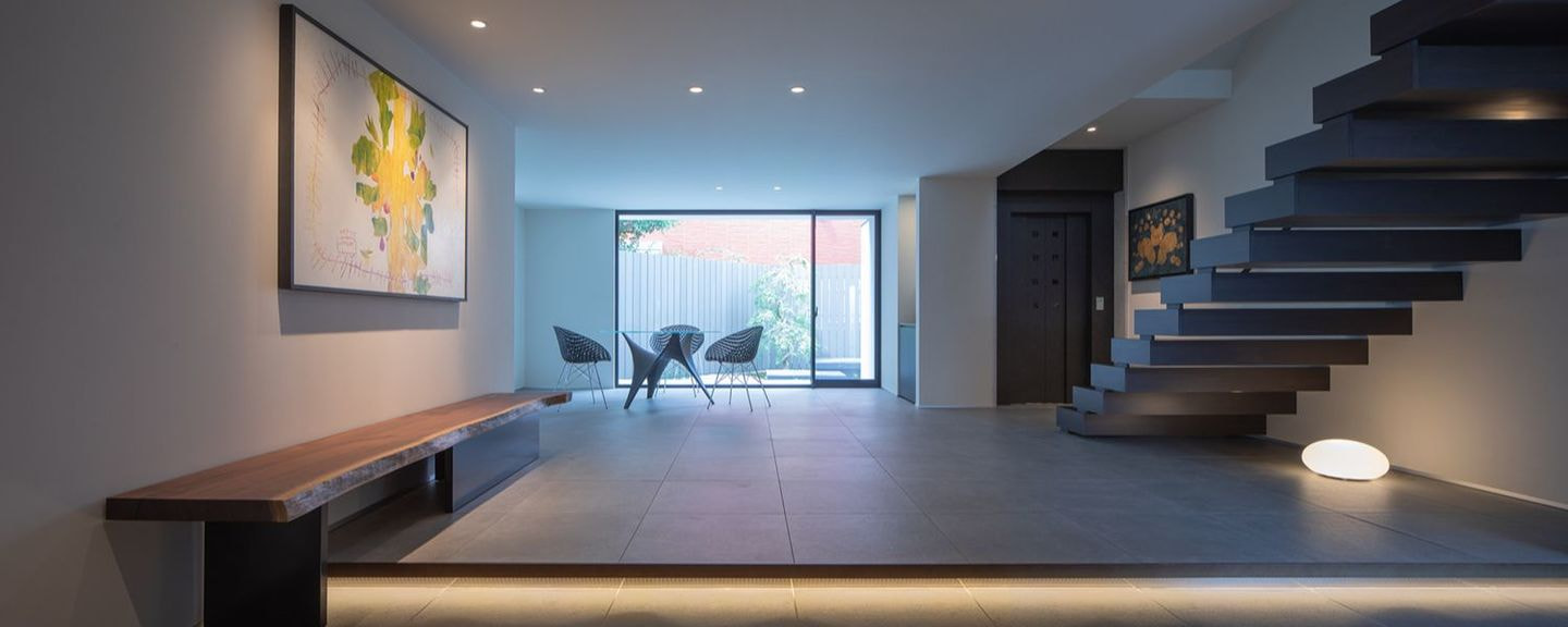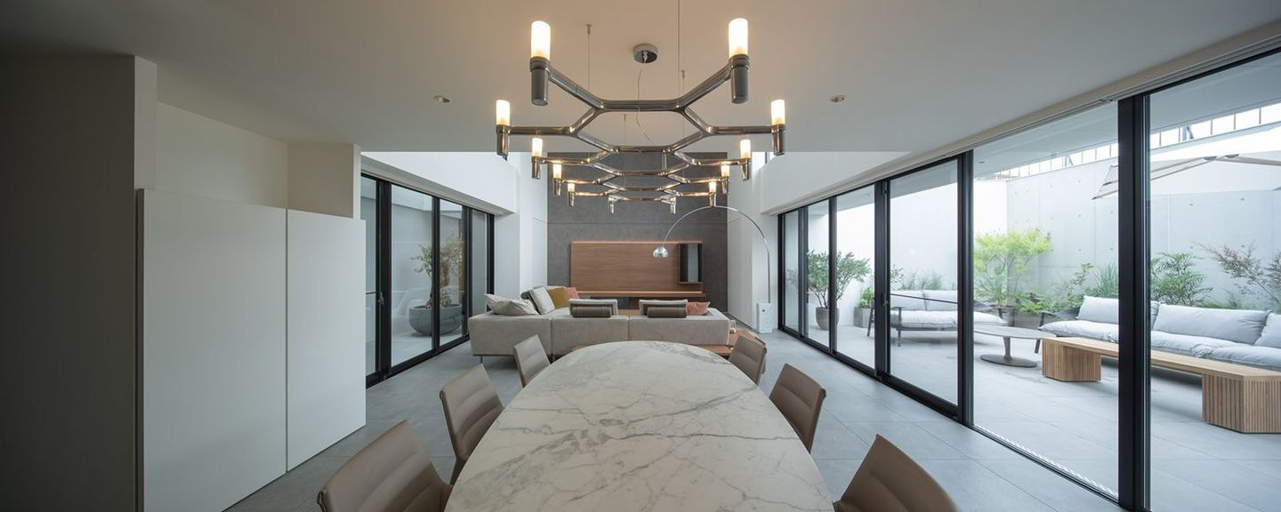 近隣住宅からの視線を遮る為に高い壁を施したプライベートテラス。アウトドア家具やプランターを配置し、屋内外で床タイルの素材を揃える事で、LDKがプライベートテラスまで拡張された広がりのある空間を演出した。