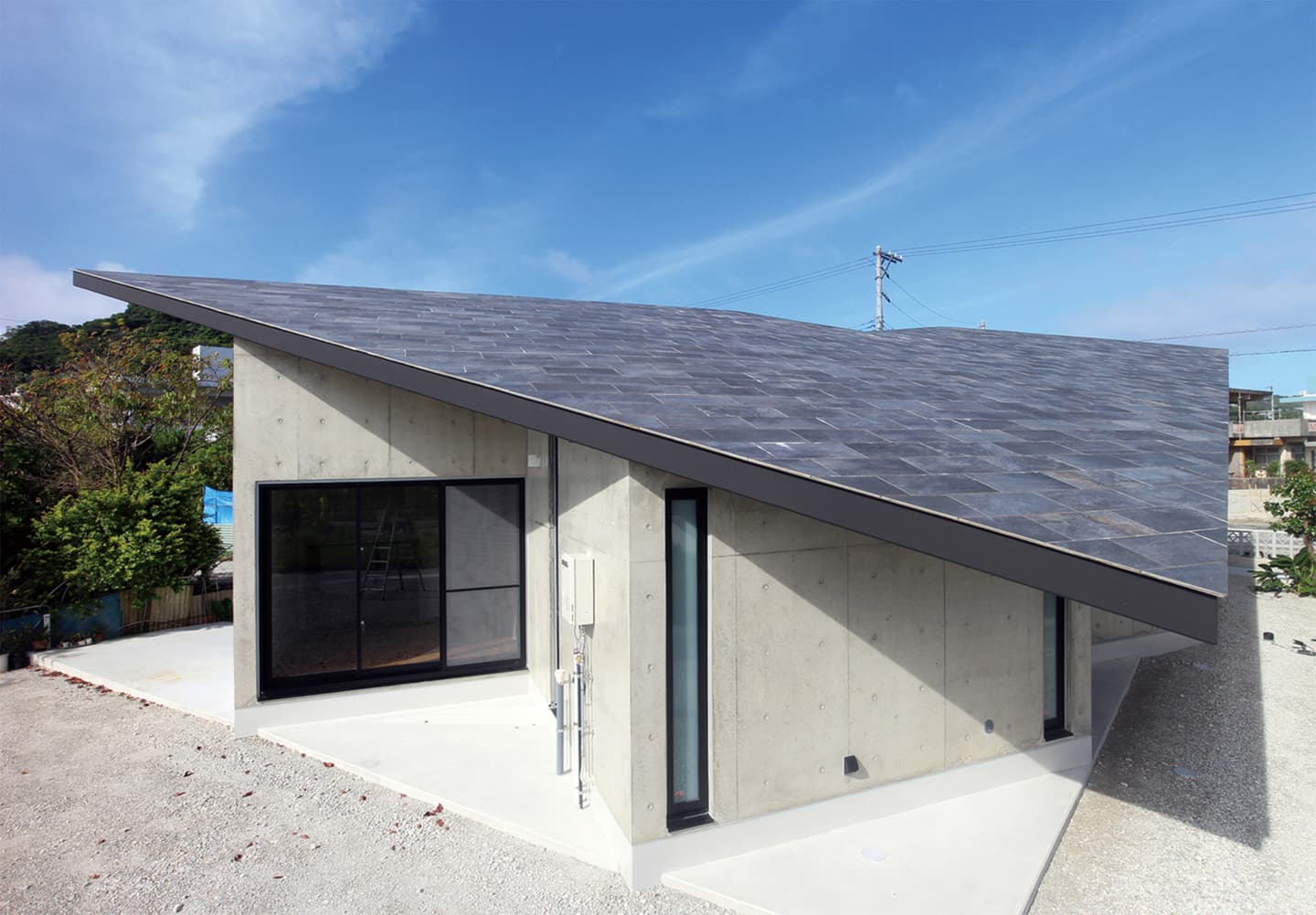 沖縄の内陸部に位置する2世帯住宅である。2世帯を包み込むように大屋根がかかり、アマハジ空間という軒下空間を生み出している。この軒下空間は、直射光を遮り、窓を開け心地よい風を取り込むためにも重要な役割を果たす。屋根形状は切妻屋根とし、深い軒の出とすることで、内外のつながりを生み出している。また、コンクリート打ち放しの壁と対比させ、地面から浮いた大きな岩のように壁に負けない重厚感の屋根を演出した。2世帯の住戸は中央の中庭を囲うように配置されており、1本のシンボルツリーが植えられている。この中庭には、洞窟に差し込む光のように屋根がVoidとなって、各住戸に光をいざなう。