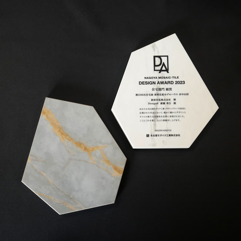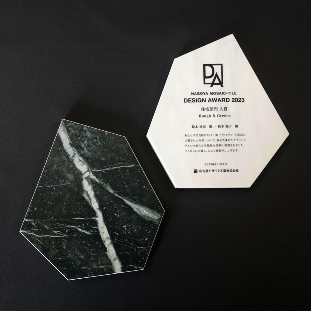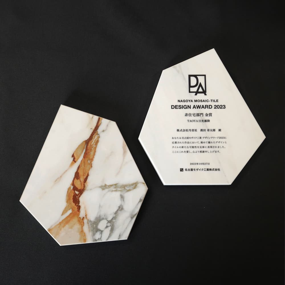 受賞の記念として、表面に大理石調タイルの最高峰シリーズ「マルミマキシマム」、裏面に3D面状の新商品「マーブルテイルズ」を使った重厚なつくりの盾をお渡ししました。裏面は賞の種類で色を決め制作しています。