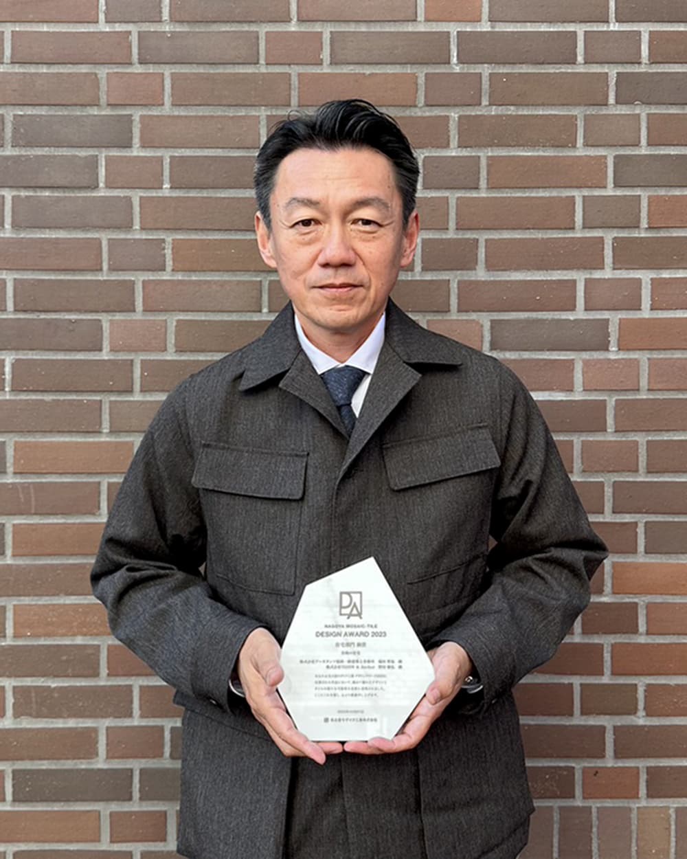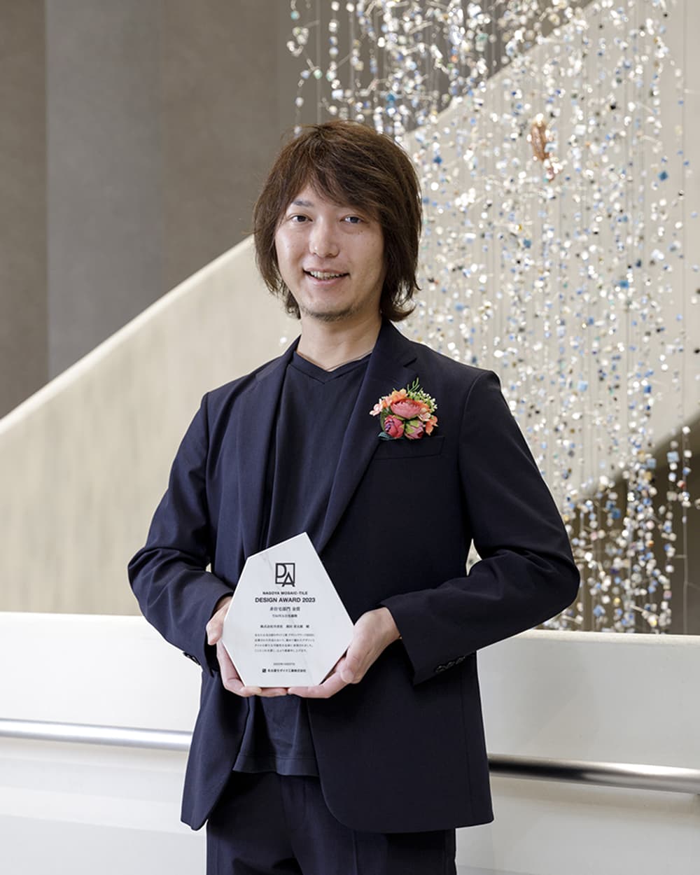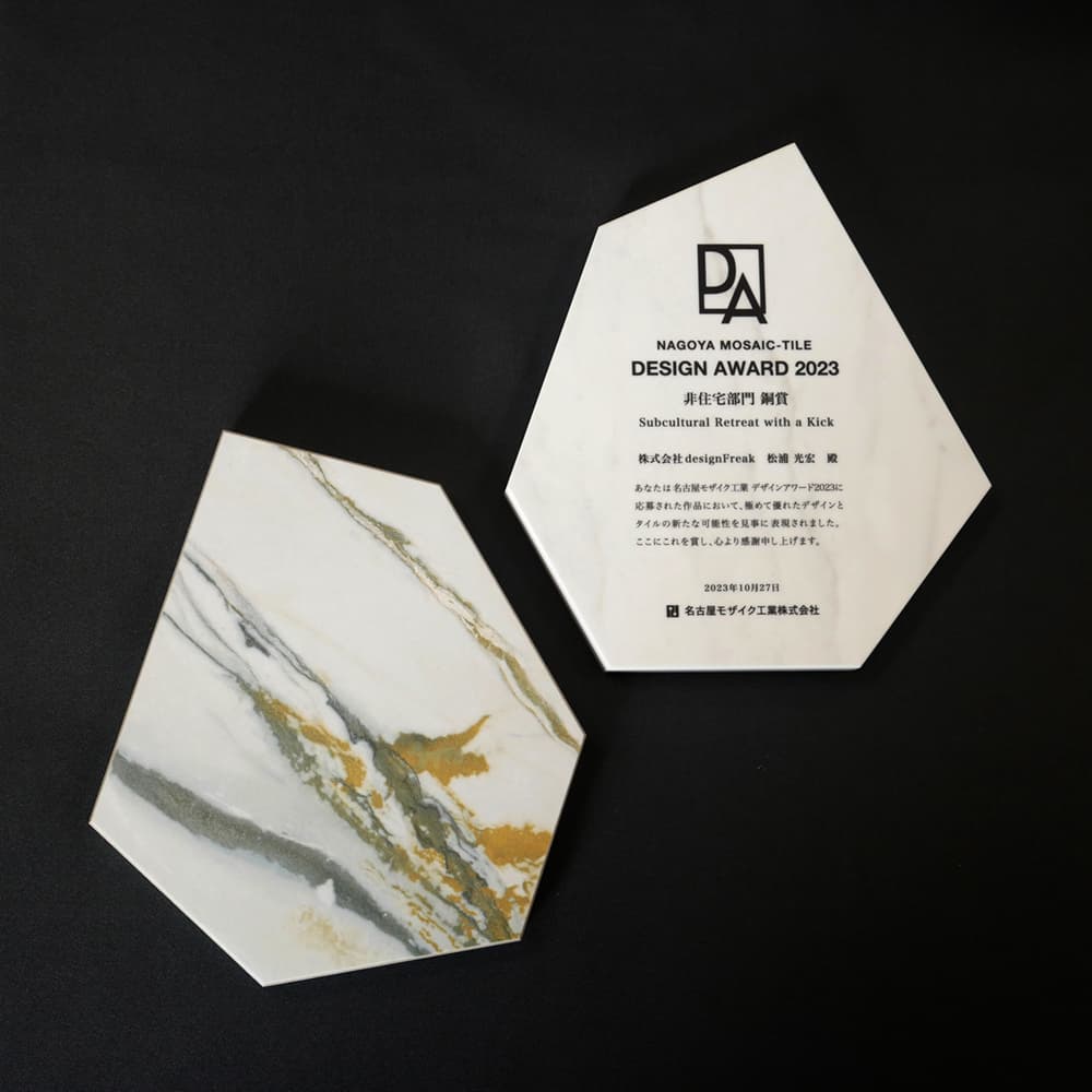 受賞の記念として、表面に大理石調タイルの最高峰シリーズ「マルミマキシマム」、裏面に3D面状の新商品「マーブルテイルズ」を使った重厚なつくりの盾をお渡ししました。裏面は賞の種類で色を決め制作しています。