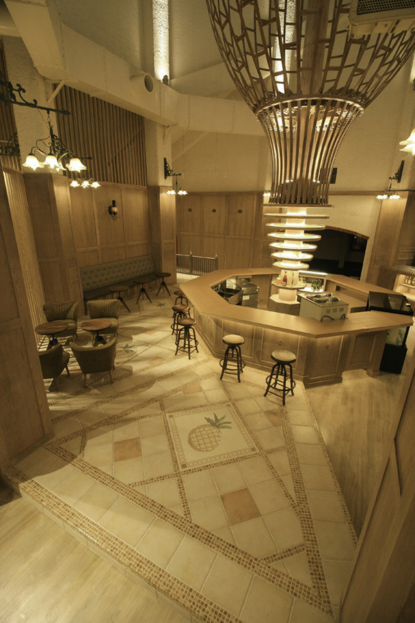 沖縄県の北部にある「ナゴパイナップルパーク」は 40年以上に渡り、多くの人々に愛されてきたテーマパークです。 同施設はパイナップルを用いた様々なおもてなしでパイナップルの魅力を伝え、多くのお客様に愛されてきました。 日本初のパイナップルワイナリーである同施設は、初めてワインを飲む若い世代にも受け入れられやすいフルーティなワインを製造しており、新しい世代のお客様にも馴染みやすいカジュアルさを全体のデザインで表現しています。 リノベーションにあたり、ワインが持つ上品なイメージを残しつつ、パイナップルの爽やかな甘さや表皮を連想させる格子状のパターンをタイルに落とし込み、視覚的にも楽しめるデザインにしました。