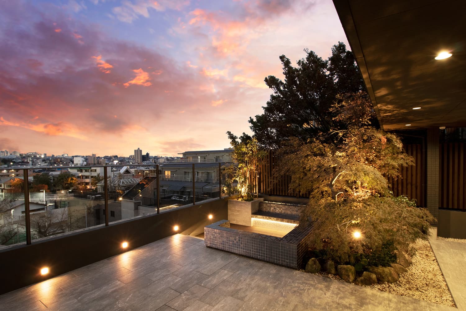 近隣住宅からの視線を遮る為に高い壁を施したプライベートテラス。アウトドア家具やプランターを配置し、屋内外で床タイルの素材を揃える事で、LDKがプライベートテラスまで拡張された広がりのある空間を演出した。