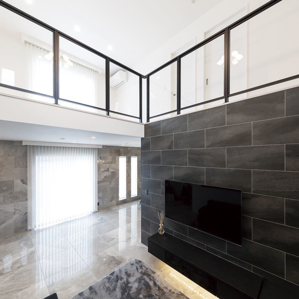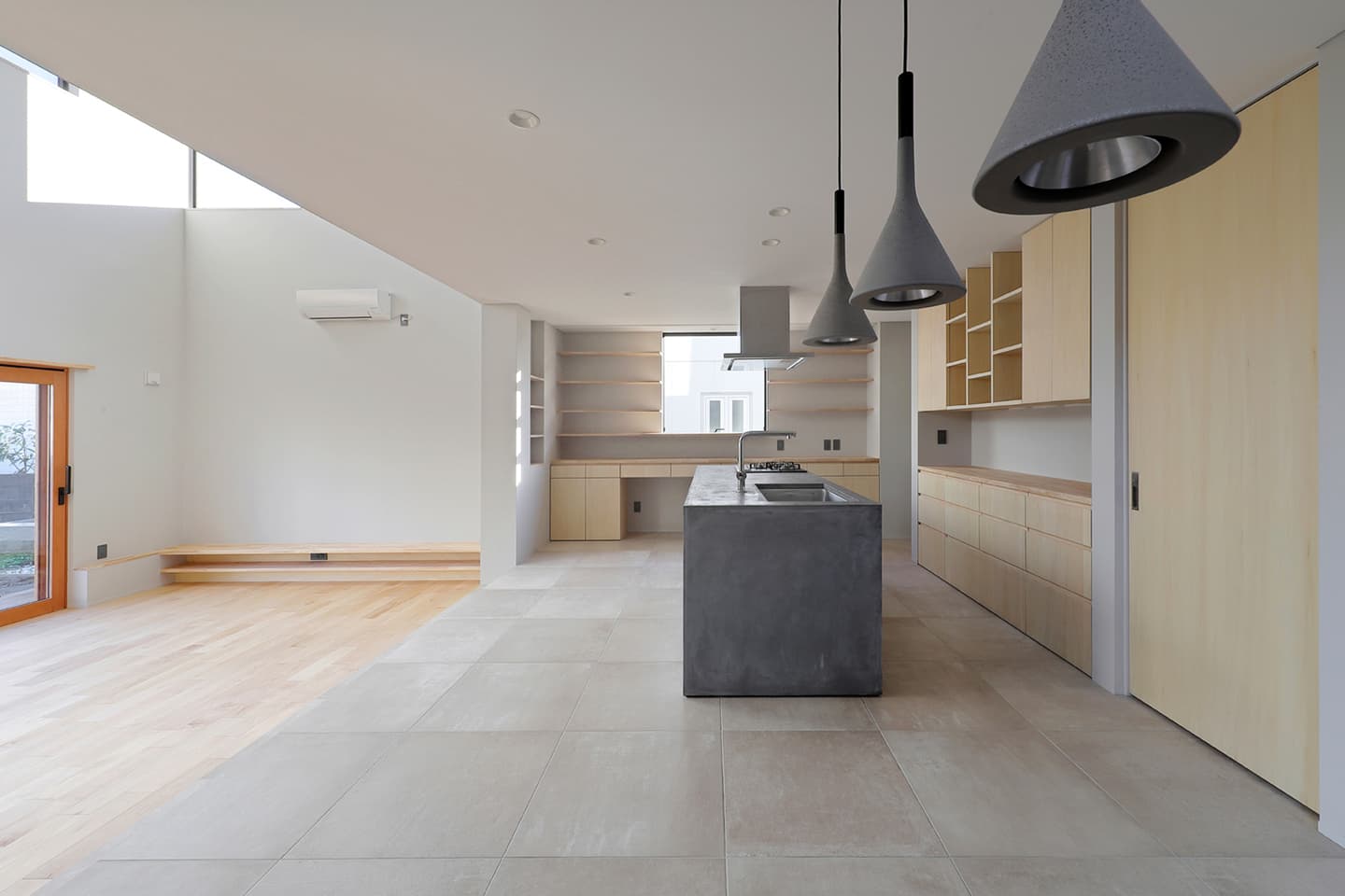 閑静な住宅地に建つご夫婦二人の住まい。ゲストを招くことが好きな施主のご要望を受け、約30帖+吹き抜けの開放感あるLDKを計画。スキップフロアを設ける事で空間に変化を持たせています。主役となるモールテックス仕上げのオリジナルキッチンは、グレージュの色むらが美しい大判タイルを合わせ、無機質な中にどこかぬくもりを感じられる空間に仕立てています。