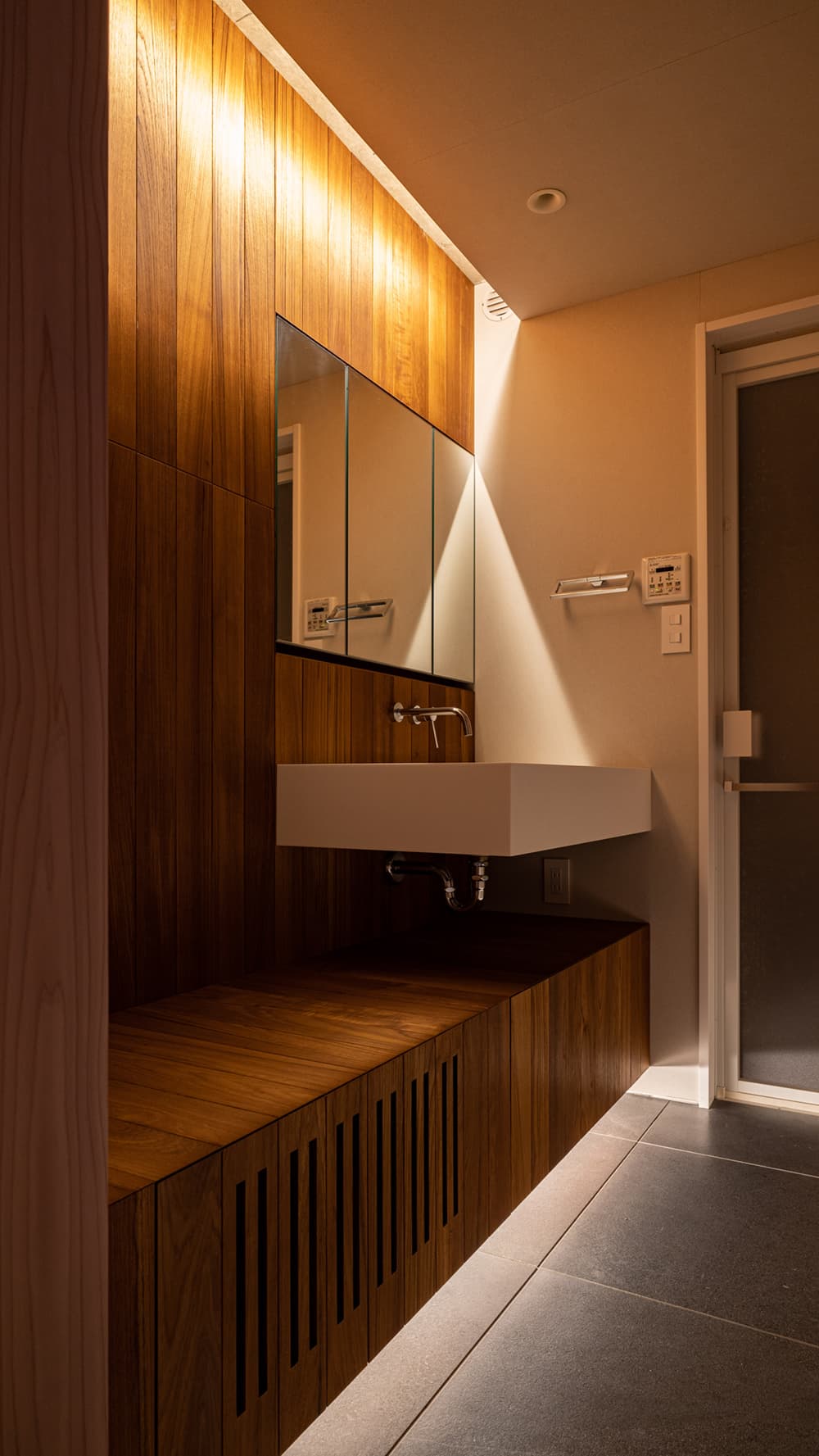 京都市内の築20年になるマンションの1室。経年による設備の劣化とライフスタイルの変化を契機にスケルトンリノベーションを計画した。友人を招いてのホームパーティや趣味の洋裁を楽しむための居心地の良い空間を目指し、「和」を取り入れながらも既存家具が映える、モダンな雰囲気のデザインとしている。繊細な組子と調和するよう模様と色合いに特色のあるタイルを組み合わせ、畳や敷居との取り合いにも配慮した。木の有機的に表現される賑わいと、タイルやコンクリートによる無機的な静寂との相反性が、不思議とこの場に「和み」を与えている。