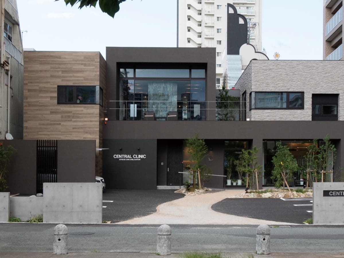 商業ビル等が立ち並ぶ街中の一角、地元住民に愛される公園に面する立地のクリニック併用住宅である。施主は、景観に溶け込む自然をイメージした建物を希望していた。施主の要望に応えるべく、外壁は木目調のタイルや、自然石をイメージするタイルを使用し、内部の床にも石目のタイルを使用した。街中の一角であるが、自然を感じさせる空間に仕上げる事ができた。住宅部分において、リビングルームの正面に位置する印象的な壁には、施主の趣味である渓流釣りの風景を連想させる滝のイメージをタイルにて表現した。