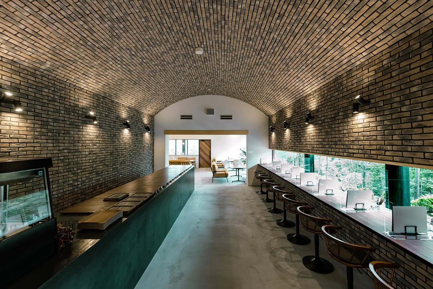 サイコロ食パンのモーニングで知られる、一宮市のカフェ「クローチェ」さんの2号店。このお店は、豊かな自然に恵まれた東白川村の交流拠点である飲食店をリノベーションして生まれました。エントランスホールをくぐると、煉瓦積みのパン窯にもぐりこんだようなトンネル空間が訪れた人々を迎え入れます。トンネル内にはパン売り場とカウンター席を設けました。カウンター席の前には緑豊かな風景を切り取る水平窓を配置。村の自然とパンとベーグルの香りに包まれた、五感で楽しめる心安らぐ空間を目指しました。このトンネル内の壁と天井の仕上げ材に「ブルージュ」を採用しました。
