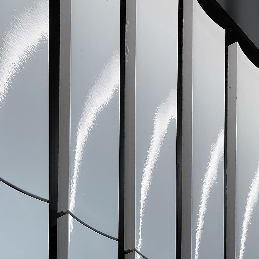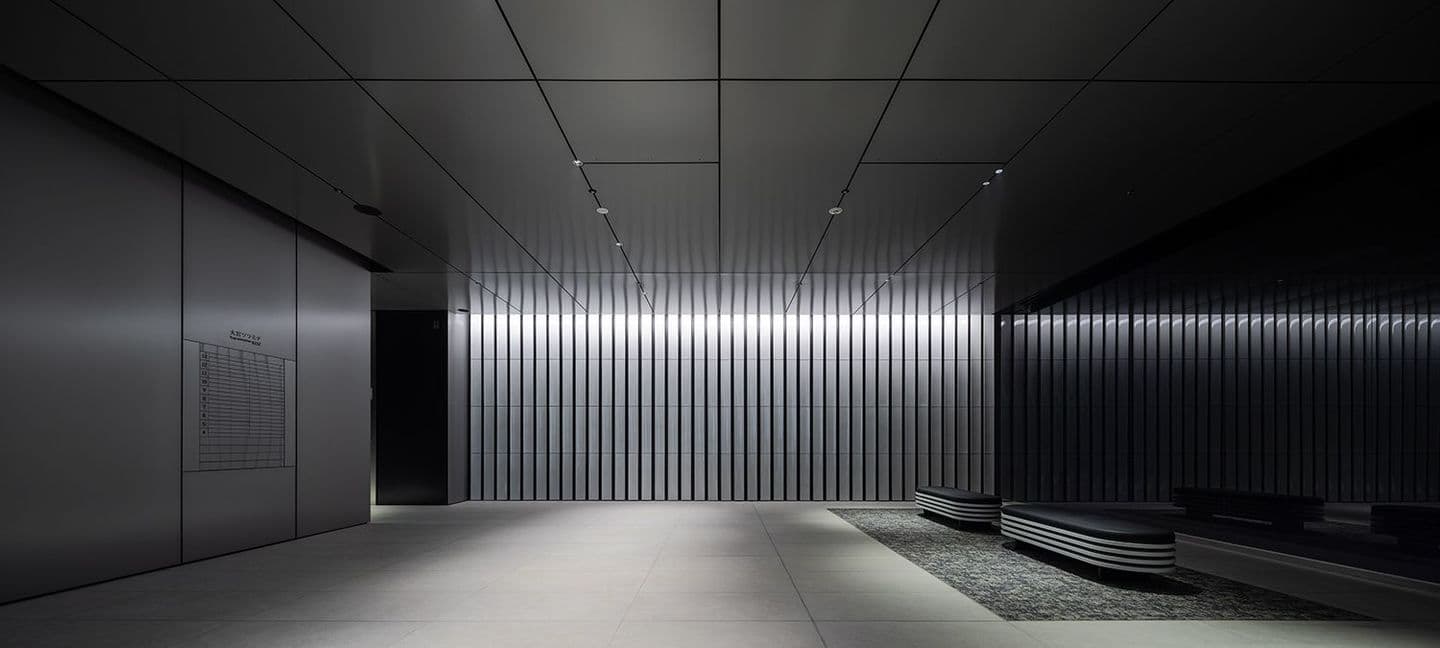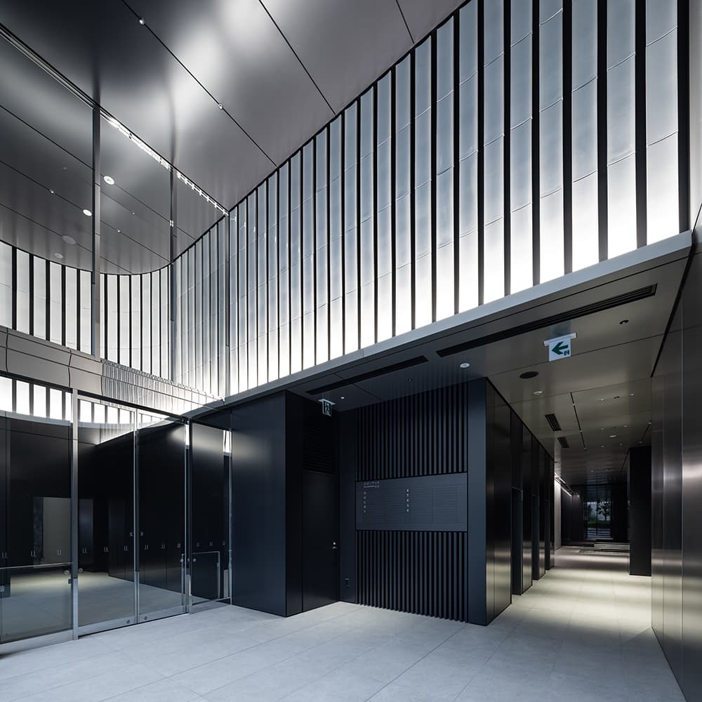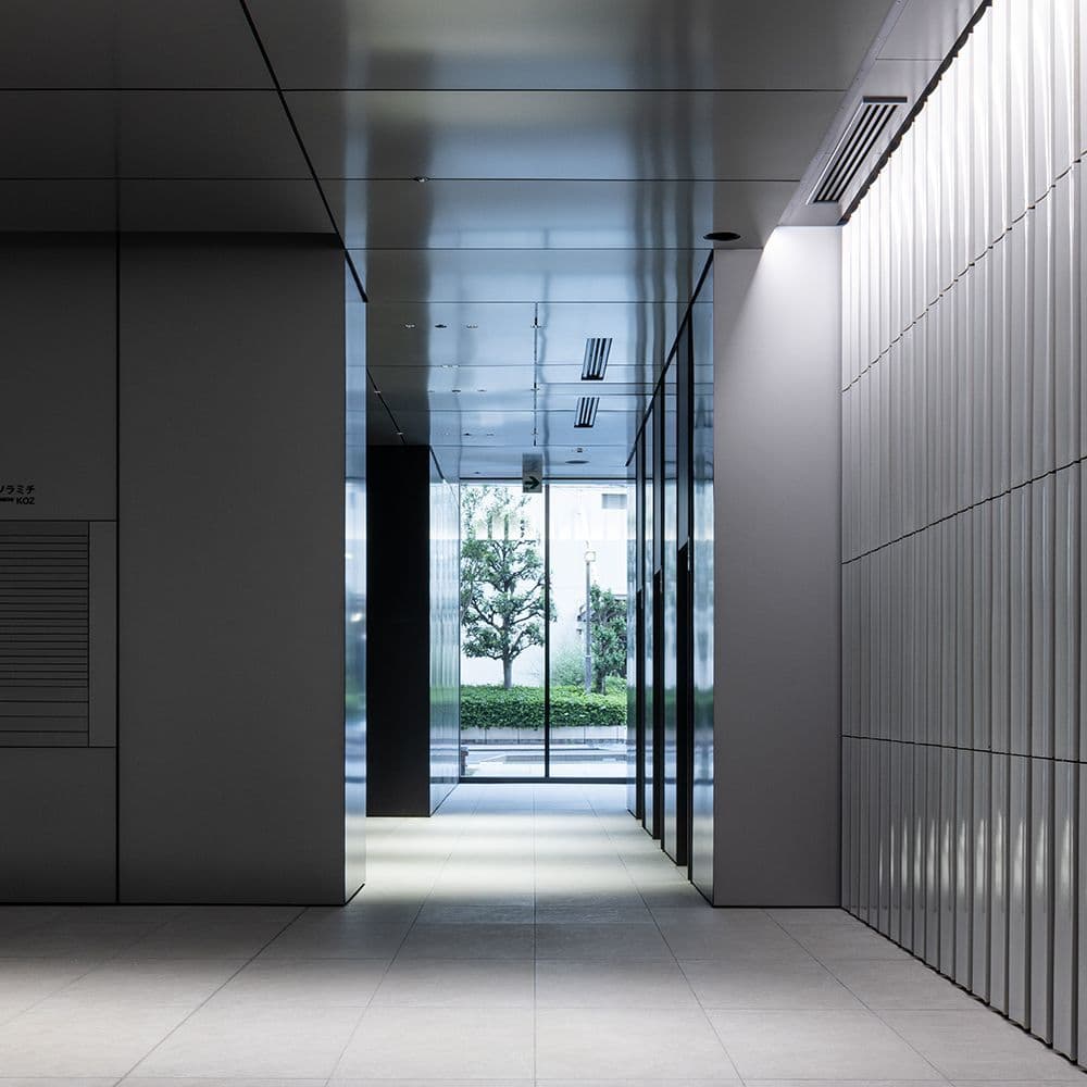 テナントオフィスのエントランスホールに特注の白色セラミックルーバーを採用した。このセラミックのルーバーがシンプルな形状の空間を変化に富んだものとしている。時間や天候により変化する外光を掬いとり、釉薬の艶が光を抽象化するその姿は、色鮮やかさはなくとも印象派の絵画を思わせる。セラミック表面の緩やかな曲率が照明の映り込みに歪みをもたらし、独特のパターンを作り出すことで、見る人の立ち位置によって異なる表情を見せている。
