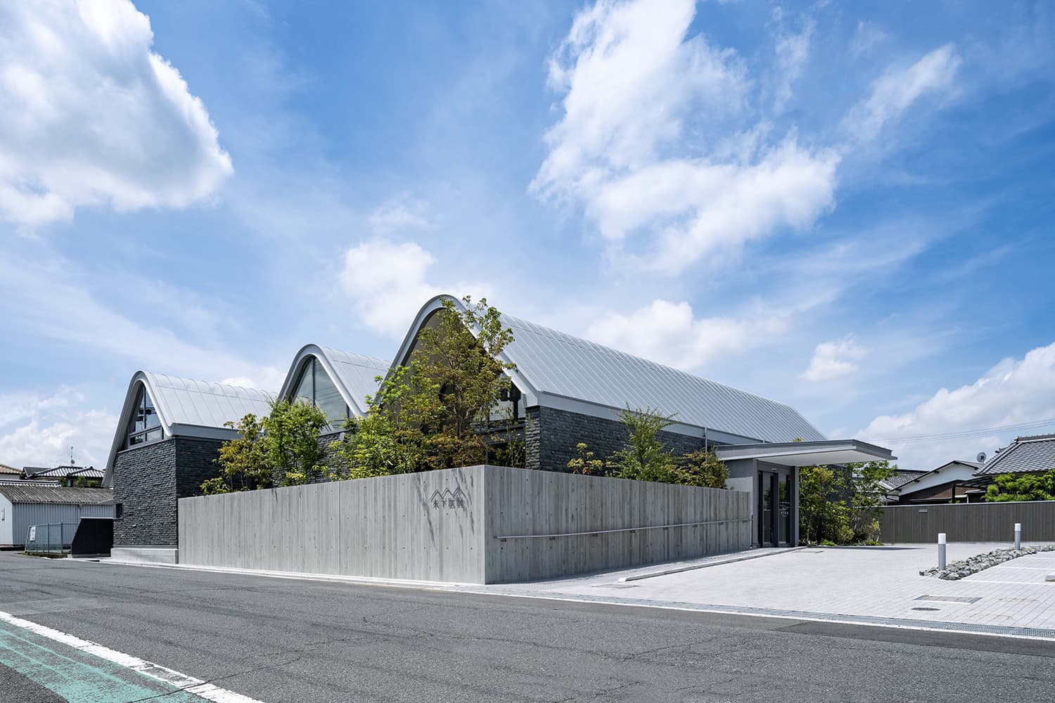 飛鳥時代に都として栄えた桜井市は歴史や文化を感じられる遺跡・史跡が多く残り、多武峰とその背後に連なる紀伊山地の山並みは美しく、大和三山と合わせて人々の心に残る風景が広がっている。木下医院の建築はその風景へのオマージュとなる三つの峰を持つ山並みをイメージした軽やかな屋根が特徴的である。屋根を受ける外壁は対照的に割肌の天然石で重厚に仕上げ、質の高さと自然な表情で風景との調和を生み出している。待合室にも外壁と同じ石壁を配し、屋根の形をそのままにした山型の高い天井、妻側の大開口から見える美しい庭の風景によって包み込まれる空間は、診察を待つ患者に心の安らぎをもたらしている。