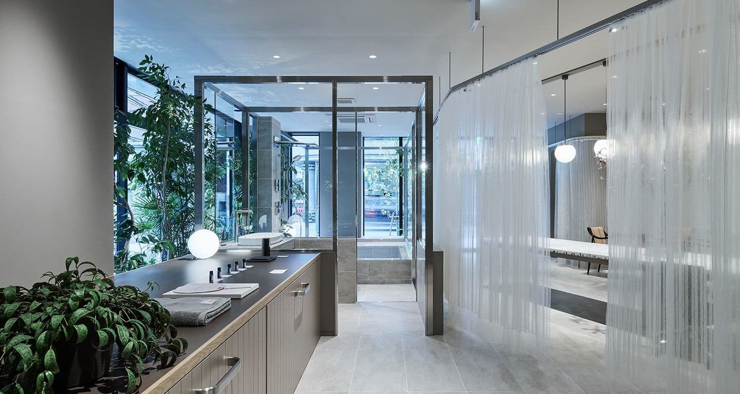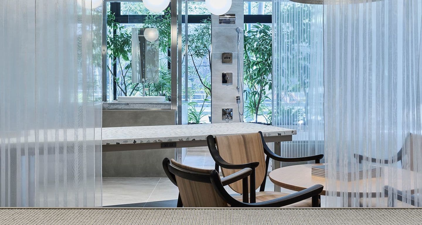オーダーメイドのユニットバスのショールーム。バスルームでは人は全裸になり湯に身を委ねます。無防備であるが為に光や風、音といった自然現象に対する感度が高まります。人も自然の一部であることに気づき、やすらぎを覚えます。単に身体を洗うという行為以上の体験がそこにあり、ブランドが大切にしている哲学をこの空間に込めました。このプロジェクトでは、ユニットバス製造時に余剰となったタイルを再利用し、テラゾーテーブルに転用。また、クライアントの別事業である食器の原材料のロスを練り込んだ左官壁を創るなど、通常廃棄されるものを再利用し、環境負荷の削減と共に新たな創造性を育みました。