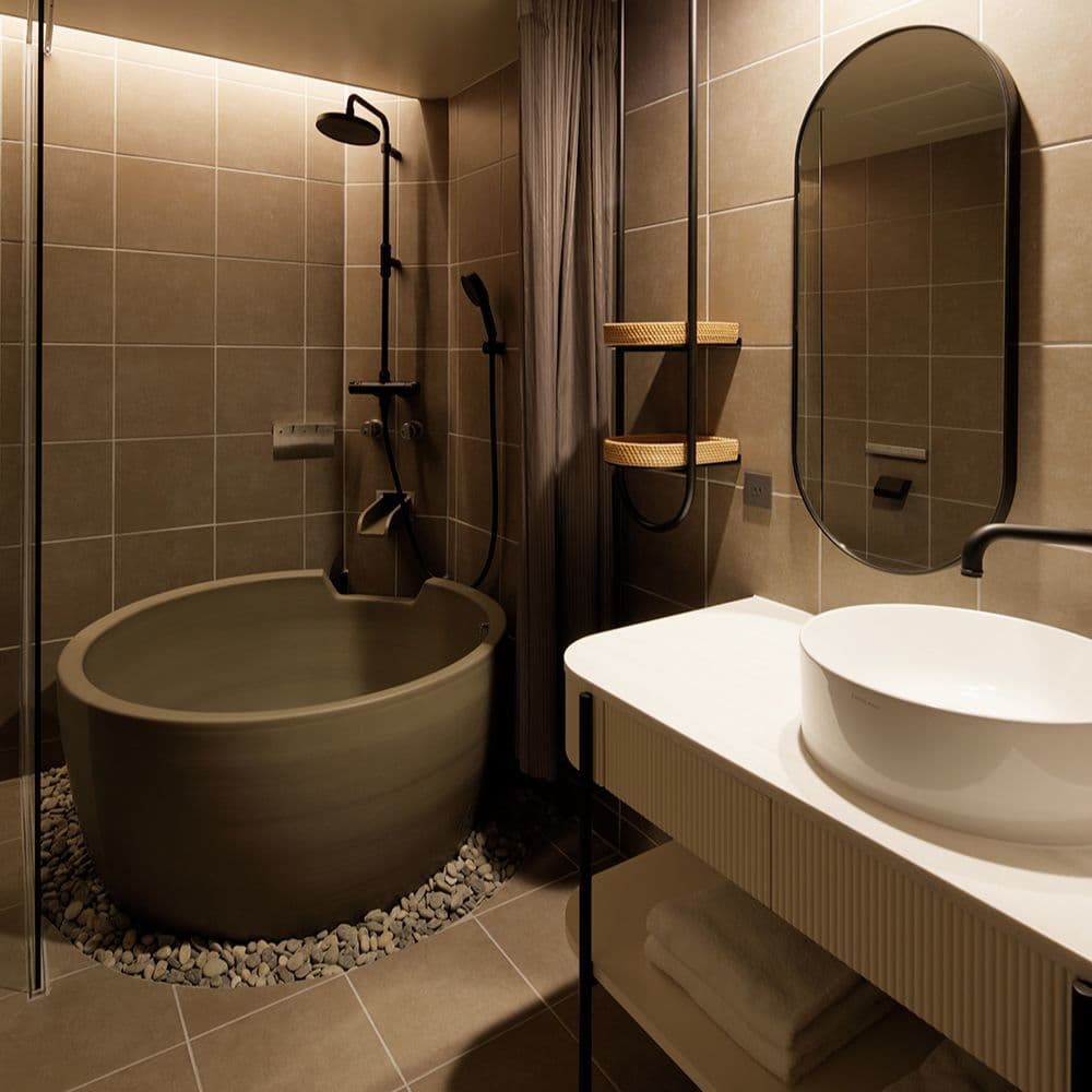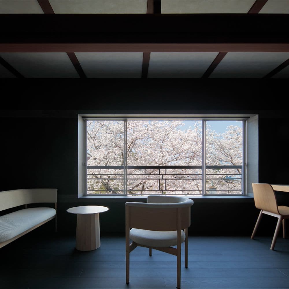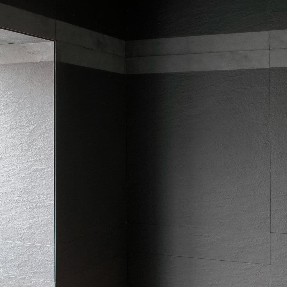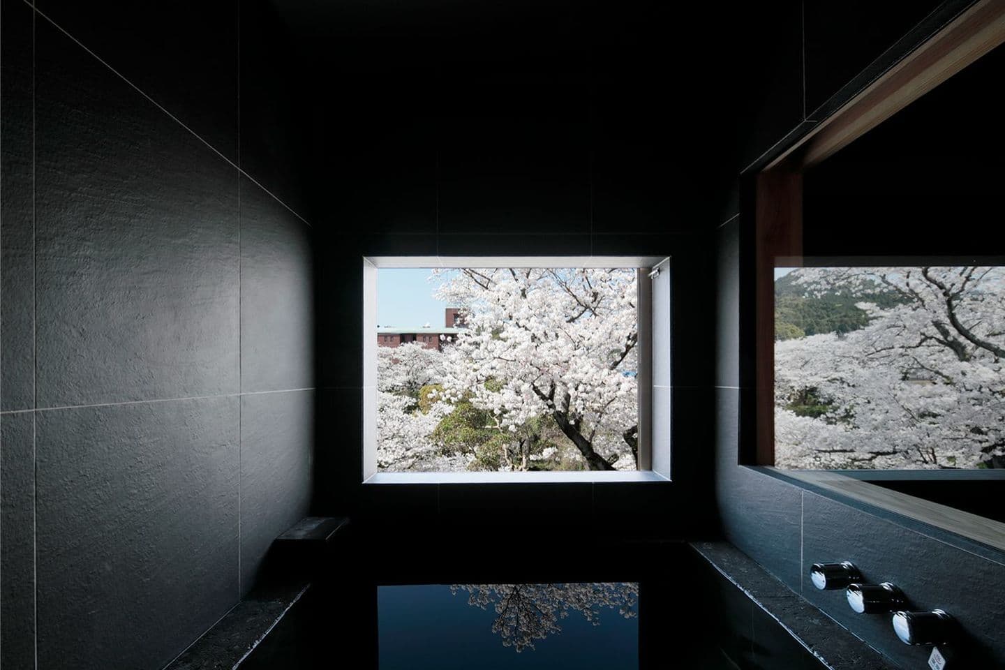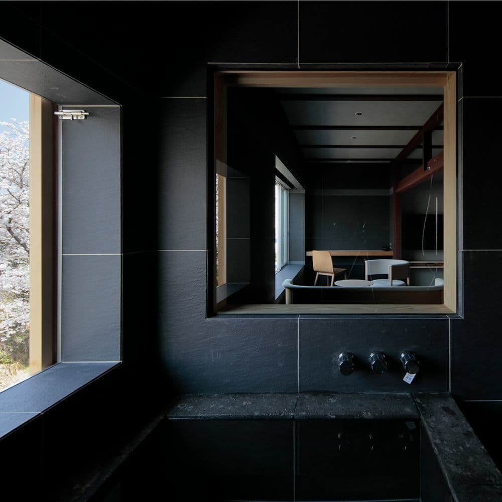 温泉付き客室の改修計画。外部に面する半露天の浴室と隣り合わせ、かつ寝室からも見える場所に広縁を配置し、浴室と同じタイルを用いてひとつながりに仕上げることで、温泉付きの客室に宿泊していることを常に感じられるようにした。タイルは箇所ごとに加工方法を変え、出隅部分はヨド加工、突き付け部分は眠り目地、そして平場部分にはサンドブラスト加工を施して2本のラインを引いている。黒いタイルに覆われた広縁のコーナー部分は、吸い込まれるような永続性を感じさせ、そのぼんやりとした暗がりの中にスッとタイルの無垢なる姿が浮かび上がる。柔らかく線が通った嘘の無い日本の空間をタイルという素材を用いて新たに表現した。
