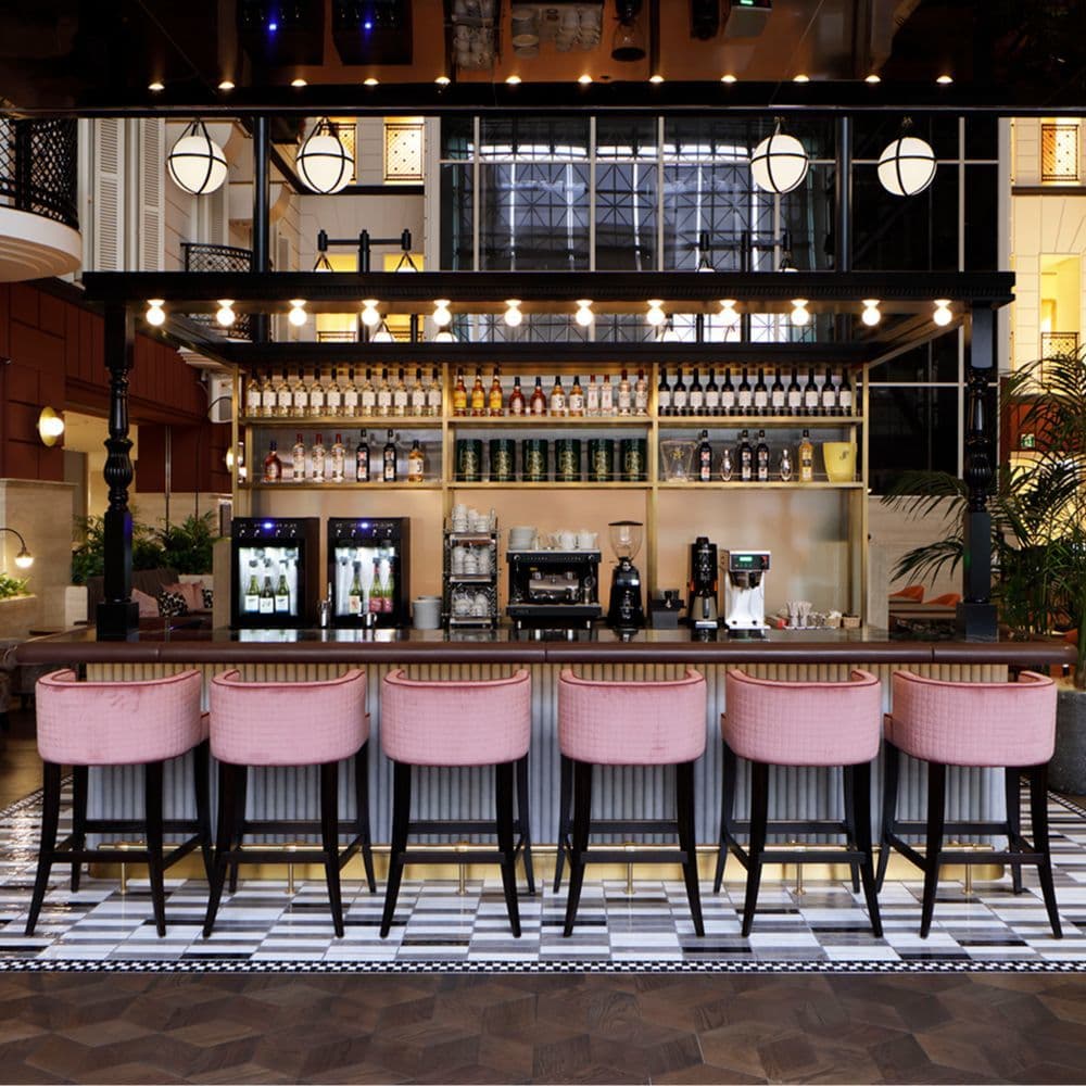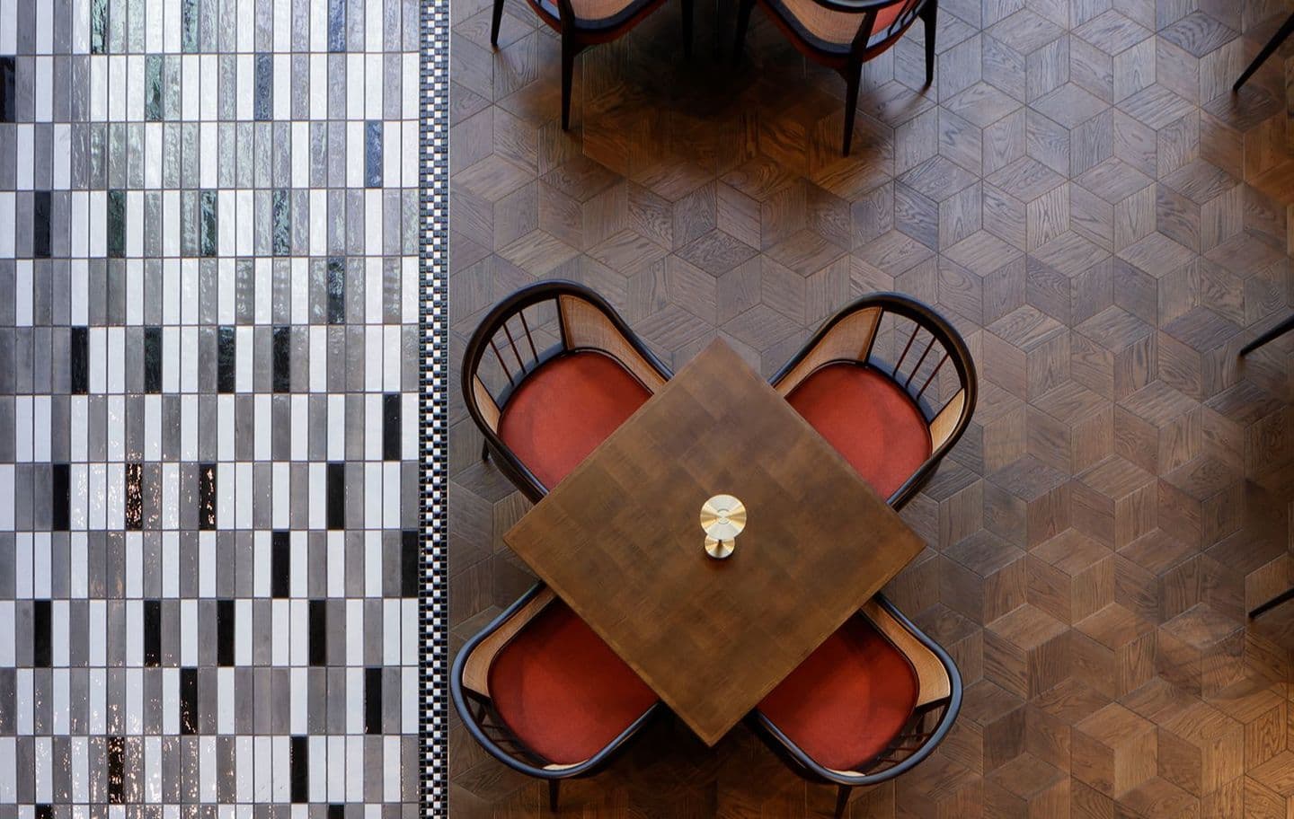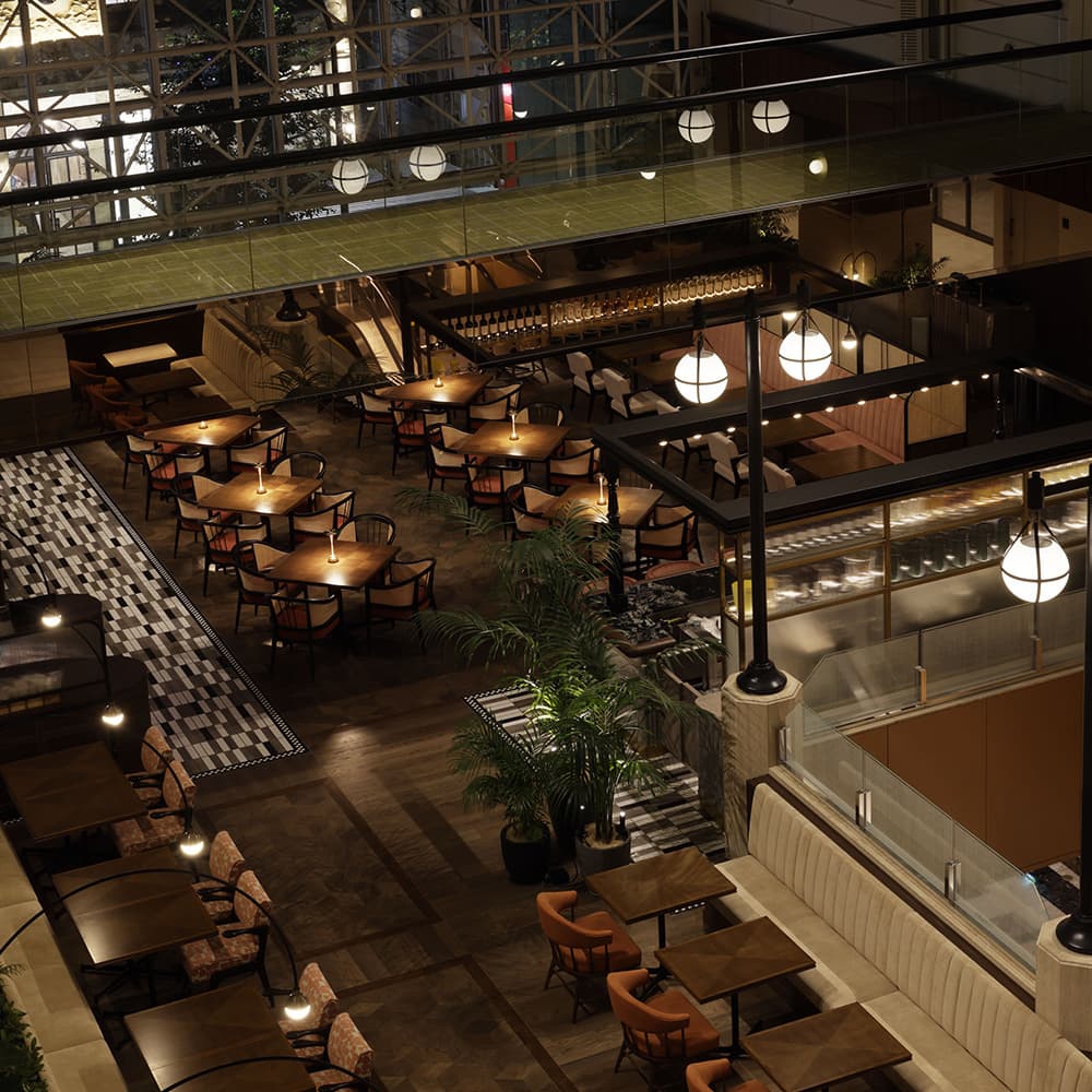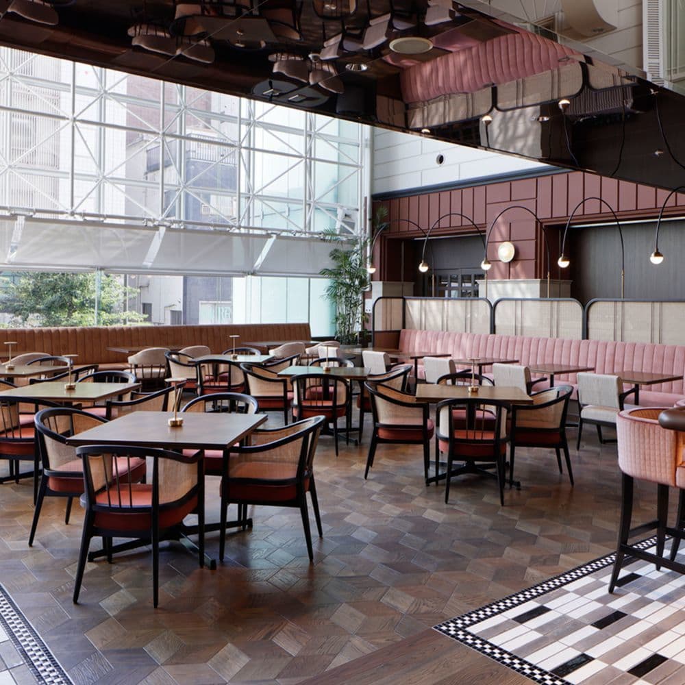吉祥寺で30年以上愛されたホテルを改修し、エクセルホテル東急としてリブランド・オープンしました。SORAEは大きな吹き抜けを持つ、ホテルのラウンジ&ダイニングです。改修前の、パリの街並みを彷彿とさせる意匠を活かしつつ、現代的な印象を加え、様々な世代の方々に次の30年愛される施設を目指しました。空間のアクセントとして、モノトーンのタイルをデザイン張りし、現代的でシックでありながら、賑やかな印象を作りました。
