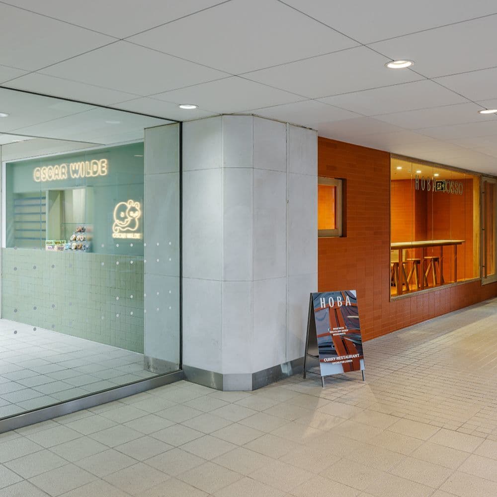 2面あるファサードを活かし1方はドーナツ屋、もう1方は昼夜で入れ替わるカレー屋とビストロとして計画した。メインマテリアルにタイルとガラスを使用し、それぞれ色味や加工、施工方法を変えることで、別の店に見えるが統一感のあるデザインとしている。タイルは可能な限り真物で使用できるように各部の寸法を調整し、現場でのサイズカットを避け、排出される建材のゴミを抑えている。照明は無線調色調光システムで昼夜で入れ替わる店の雰囲気をカラー照明で切り替える演出を提案した。野菜を様々な調理法で調理し菜食料理の可能性を追求する店舗コンセプトにインスパイアされ、限定されたマテリアルを多様な表情に見せるデザインを目指した。