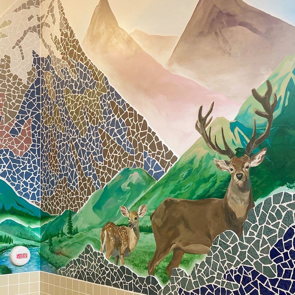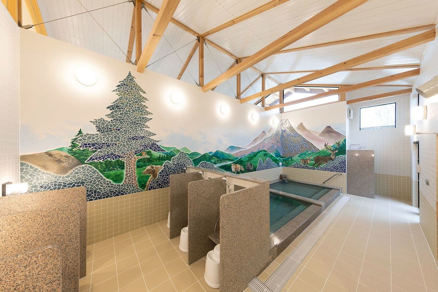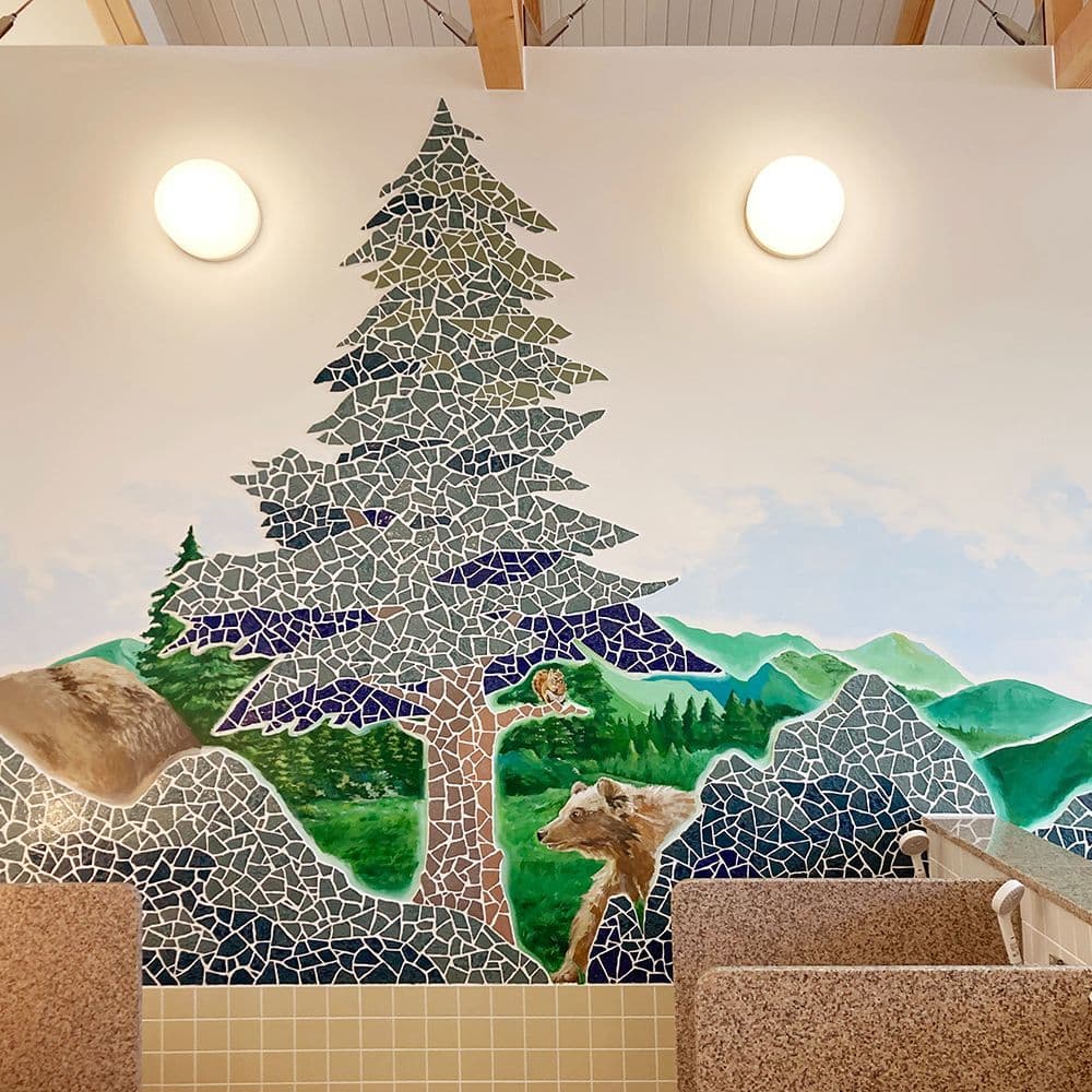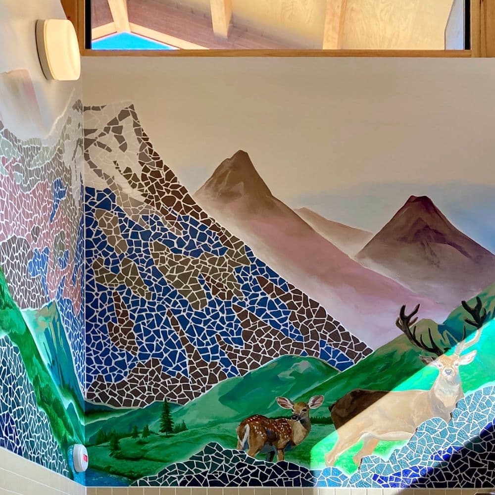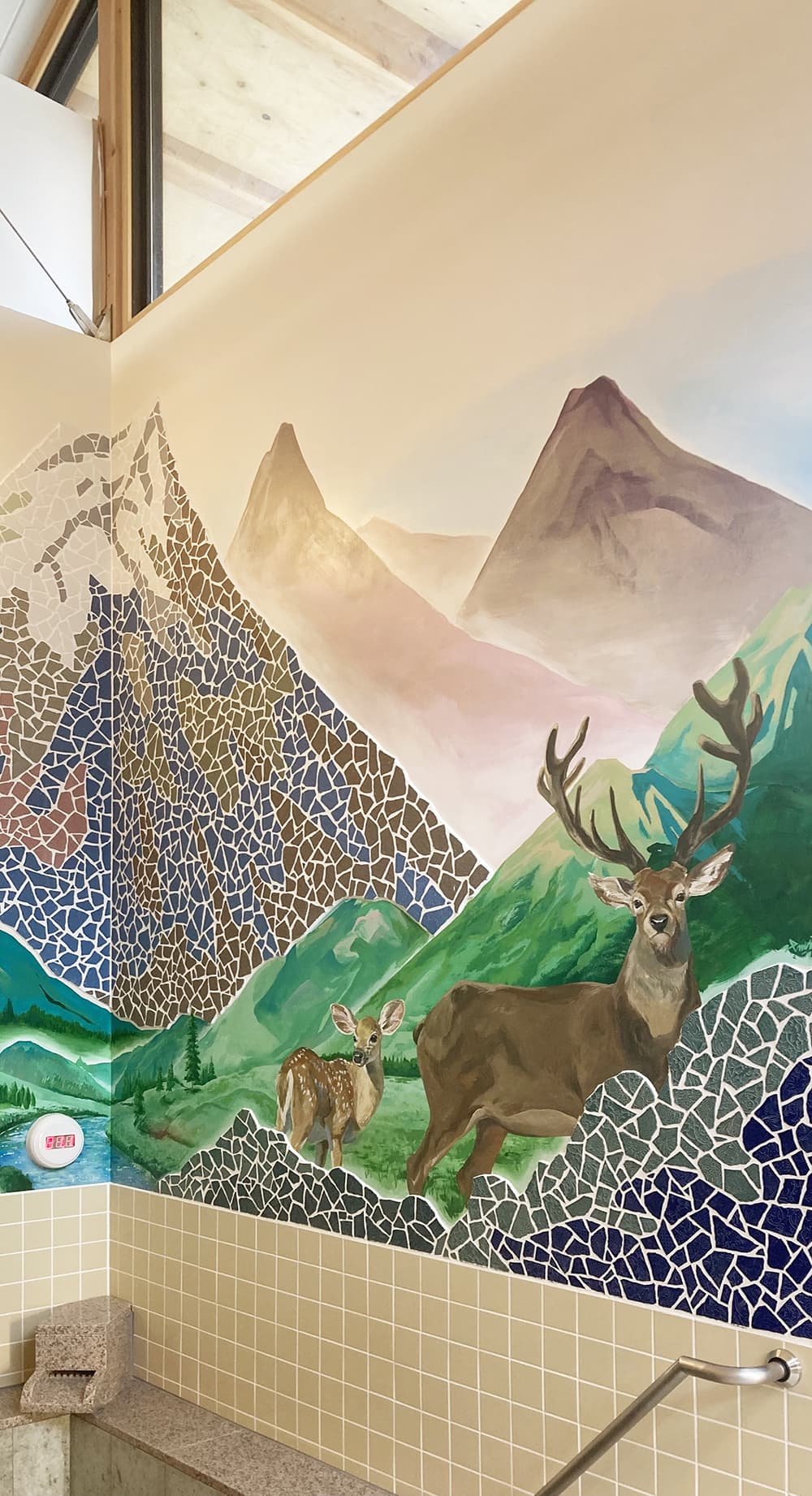 WEINS PARK 海老名にあるU-BASE CAMPの温浴施設。温浴場とサウナにアートを落とし込むことで画一的ではない、唯一無二の温浴施設を計画し、施設の温浴場の男女双方の壁面を手掛けました。片面はスプレーで描いたビックバン『生命の誕生』を表し、反対面にタイルとペンキで大自然『生命の息吹』を描きました。ウエインズパーク海老名では人々に“車の可能性”を提案しています。施設の一角にある温浴場では、何者にでもなれた少年少女時代「夢見る心」を意味した宇宙の湯と、その反対側にある「大地の湯」では、車で何処にでも行ける昨今、あの頃夢見た景色を探しに、また自分の好きな場所と壁画を重ね合わせ、豊かな暮らしや思い出へ馳せる想像を空間に込めました。タイルは材質や模様にこだわり、大地の表現に活かしました。