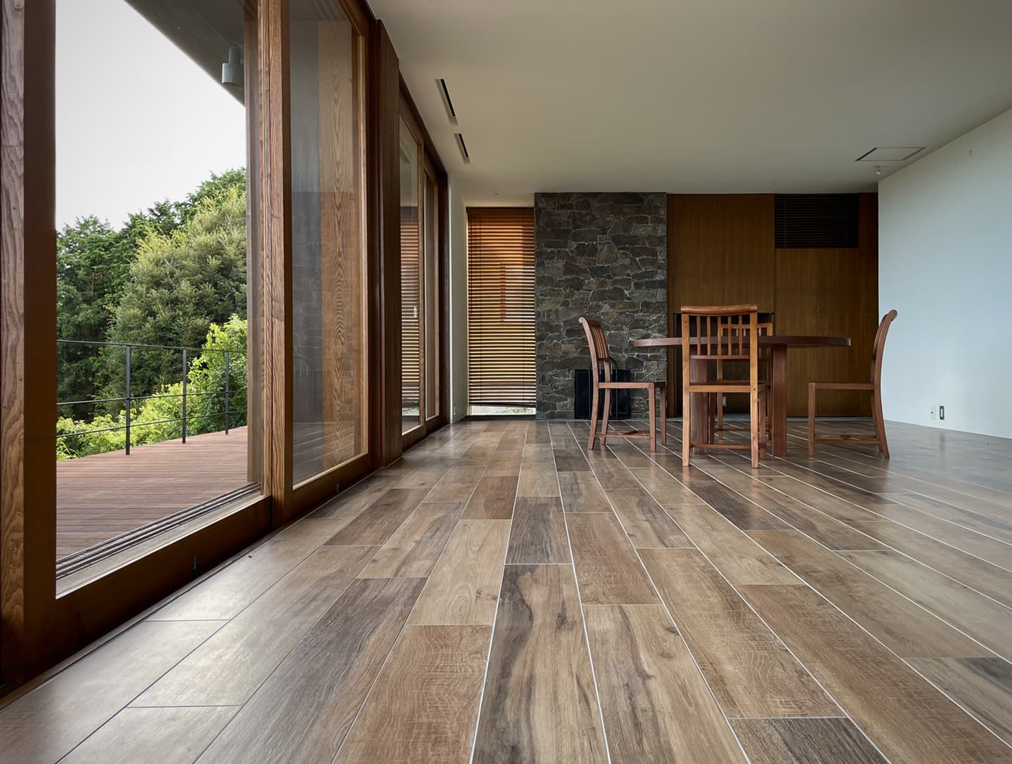 木目調タイルの「フレンチオーク」と木製サッシ・根府川石。自然素材とのバランスが絶妙!窓の外の木々までもが空間の一部であるかのような錯覚に陥る、大自然の素晴らしさを取り込んだ作品です。
