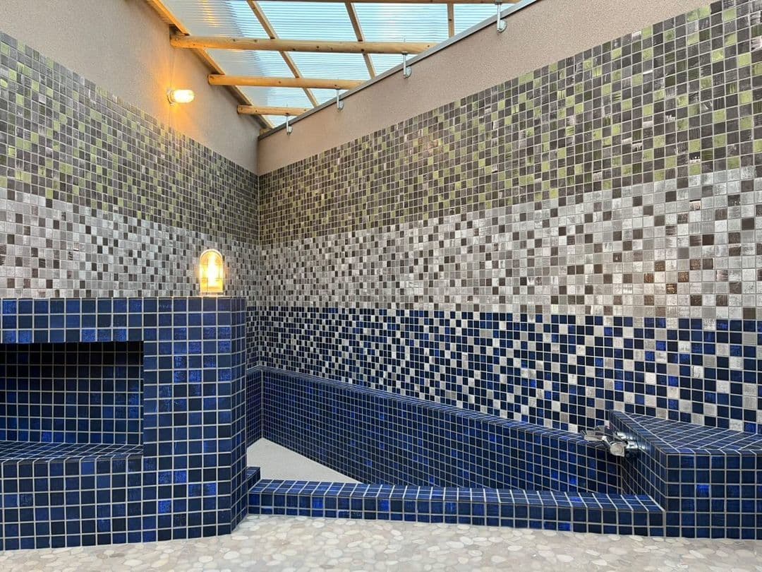 空間の形ゆえに、配色から配置まで丁寧に構成された完成度の高い露天風呂です。出来上がりを楽しみにされていたこの場所、まさに“推しタイル”のある空間ですね。ぜひ入ってみたい!そう思う作品です。