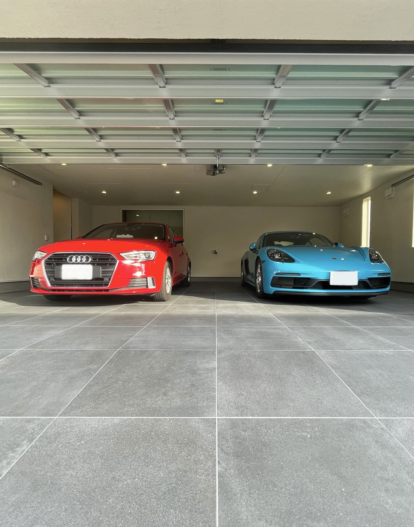 ビルトインガレージ床に20mm厚のタイルを使用した、ディーラーのモデルルームのような高級感溢れる空間です。ニュアンスのあるグレーのタイルで、お気に入りの愛車がよりステキに映えます!