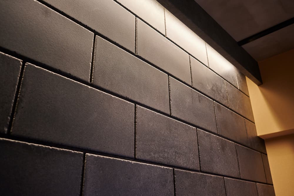 黒のブライトタイルに反射する新緑がとても美しい写真です。「タイルに映る新緑で季節を感じる。」なんて感動的なコメントでしょう。平行四辺形のタイル「シェヴロンウォール」の施工技術の見事さにも注目しました。