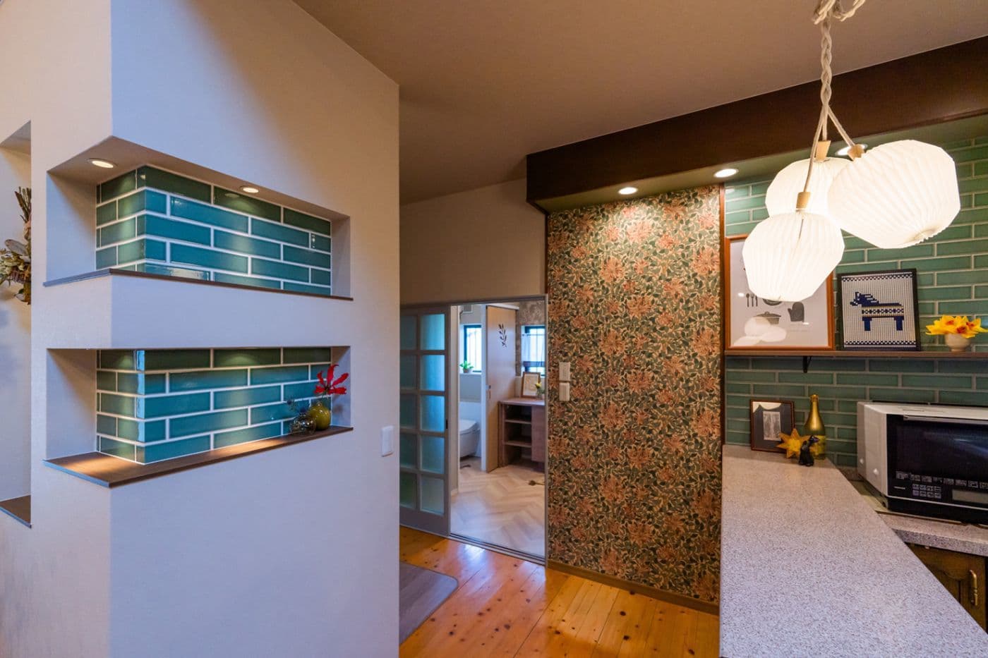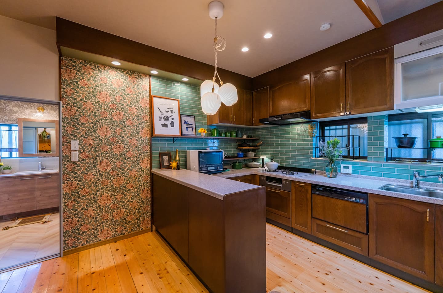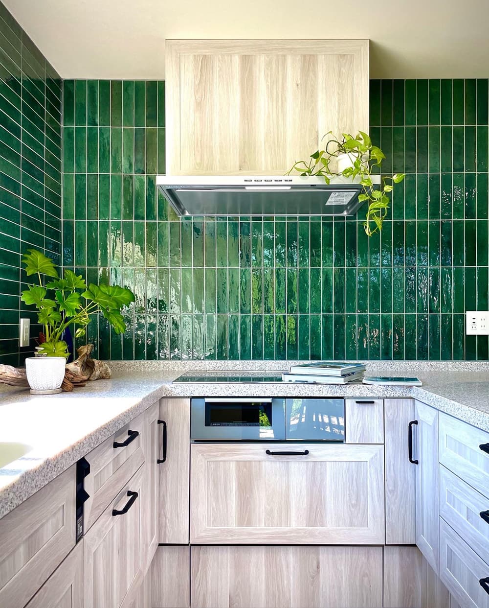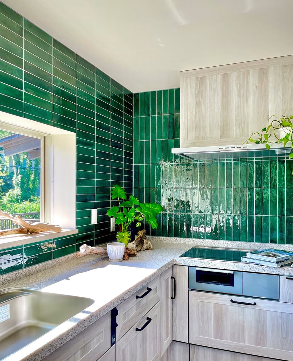 まるで伊豆高原の自然に抱かれているような、まさにテーマにぴったりの素敵な作品です。1枚1枚色合いに幅のあるタイル「クロジョーロ」が外の明るい陽差しを受け艶やかに輝く様は、初夏の木々を思わせます。縦張り横張りの組み合わせで広がりや動きを表現しており、森林の中にいるような清々しさも感じさせてくれます。季節感に溢れる気持ちの良いキッチンで、お料理も団欒も楽しんでください。
