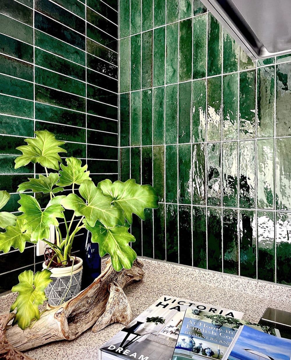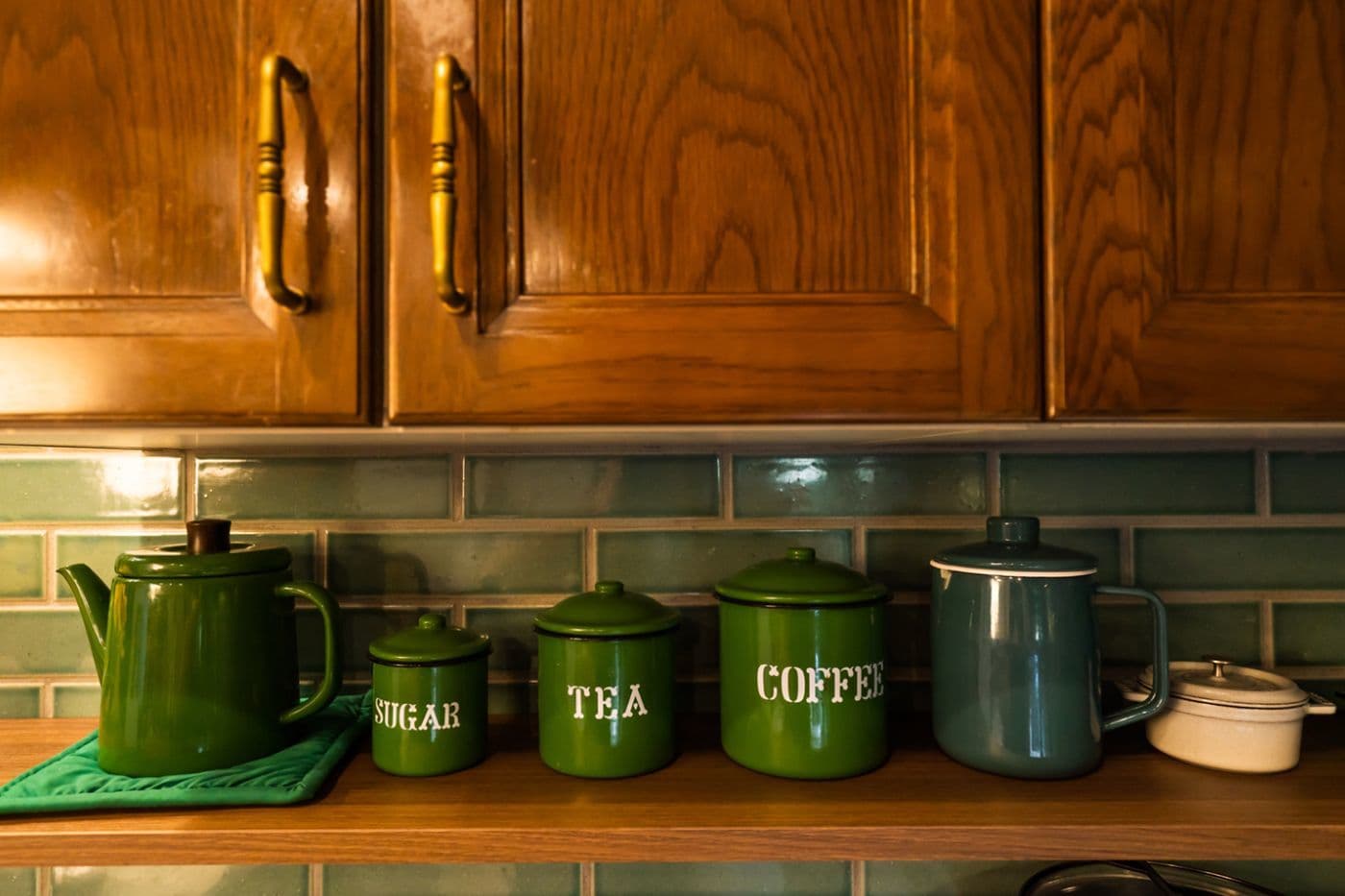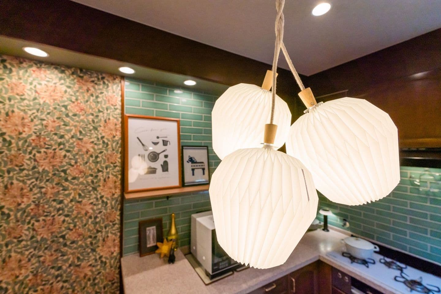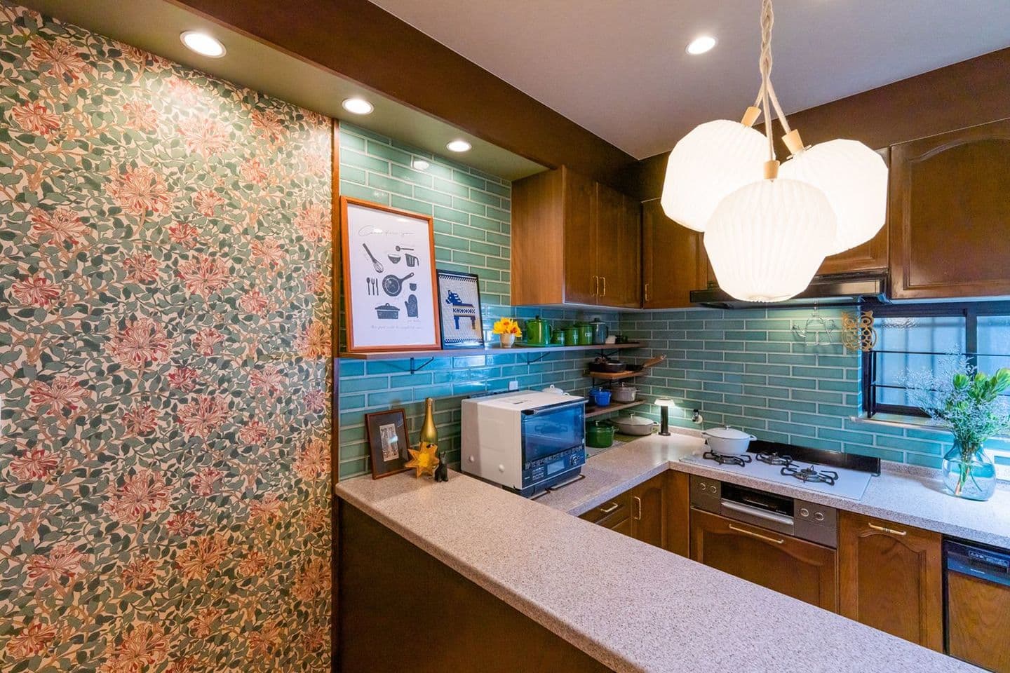 まるで伊豆高原の自然に抱かれているような、まさにテーマにぴったりの素敵な作品です。1枚1枚色合いに幅のあるタイル「クロジョーロ」が外の明るい陽差しを受け艶やかに輝く様は、初夏の木々を思わせます。縦張り横張りの組み合わせで広がりや動きを表現しており、森林の中にいるような清々しさも感じさせてくれます。季節感に溢れる気持ちの良いキッチンで、お料理も団欒も楽しんでください。