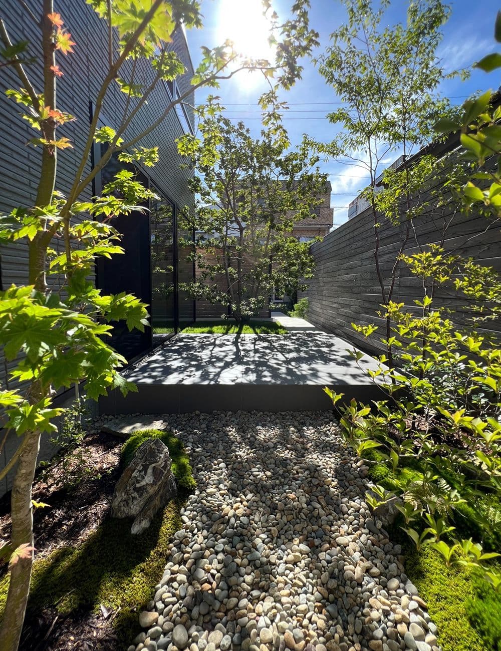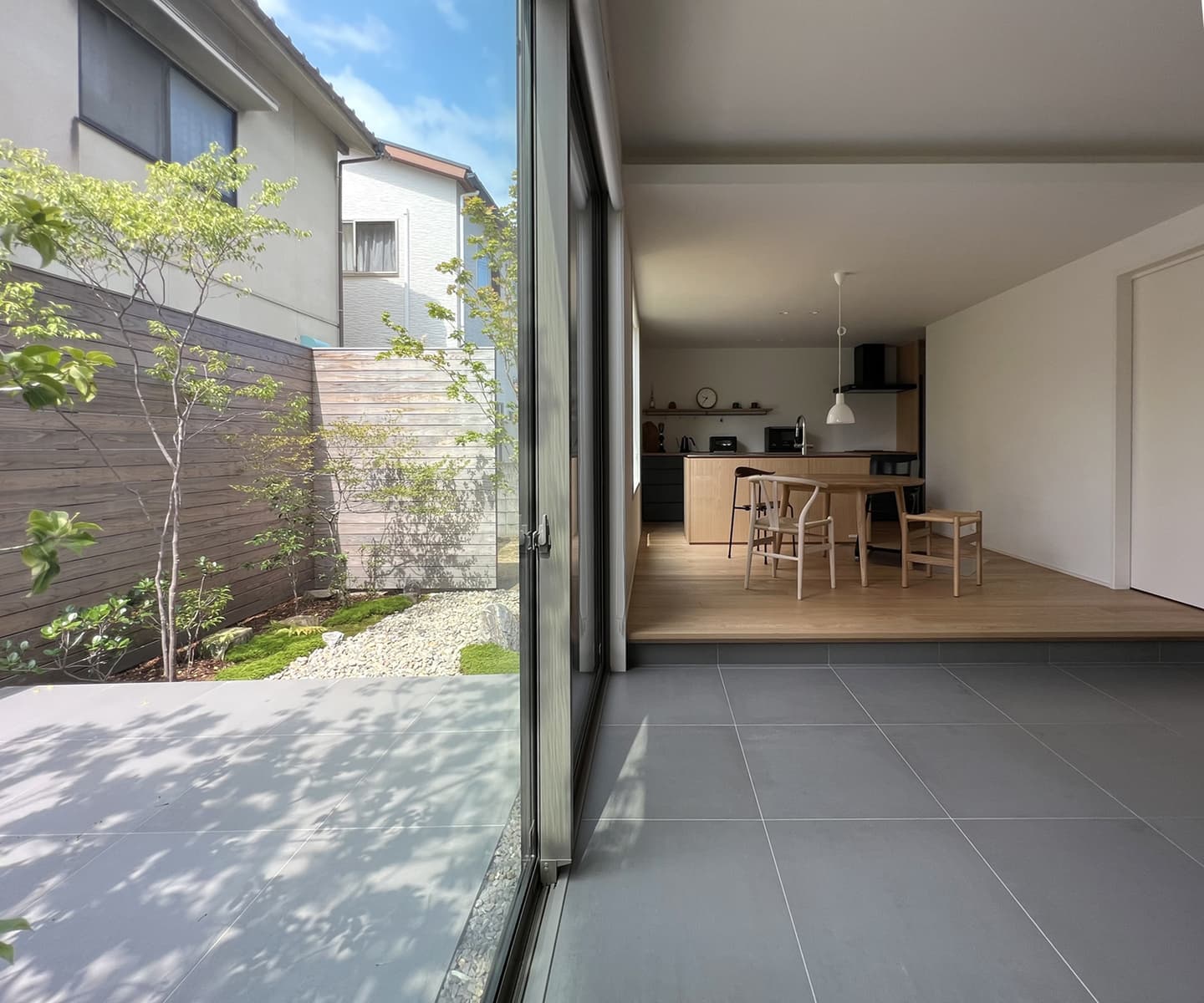 家づくりにとって植栽計画が大きな要素であることがうかがえます。タイルの床に落ちる木々の影が切り絵のようでとても素敵です。日々成長する植物と四季折々の葉が落とす影は日々変化し、時の流れを感じる心豊かな空間を作ることに改めて気付かされました。また同じタイルを内部まで繋げた土間の様な床が、外の心地よさを室内にまで引き込んで、開放感のある魅力的な空間をつくっています。