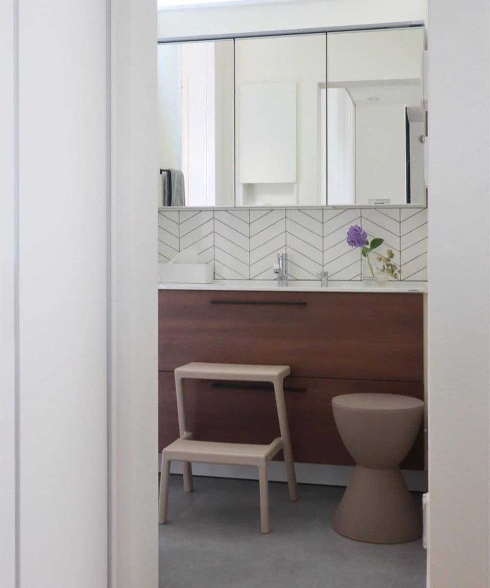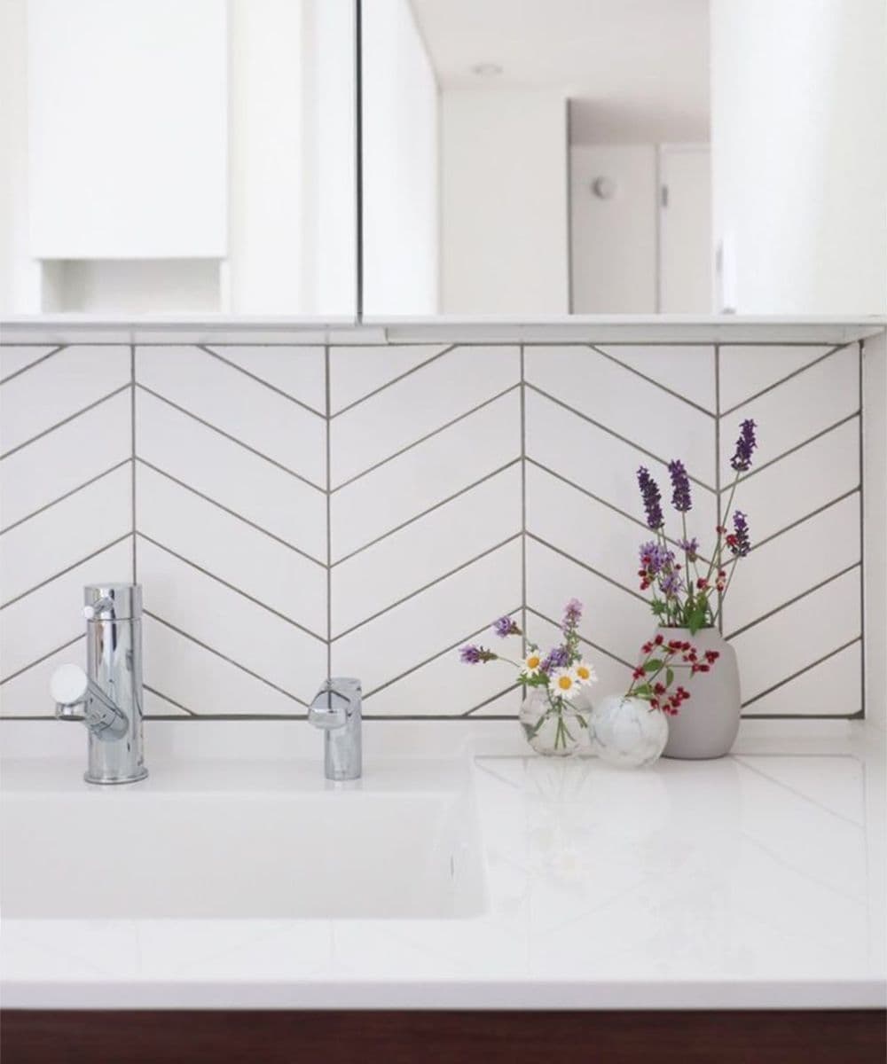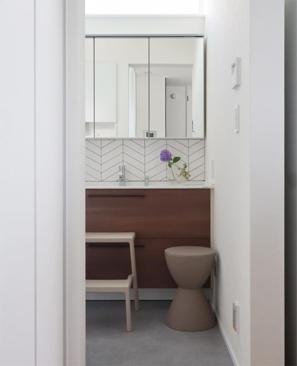 白を基調にしたシンプルな洗面空間の中、平行四辺形のタイル「シェヴロンウォール」が、さりげなく花や植物の瑞々しさを額縁のように演出する素敵な作品です。それぞれの季節の植物たちから癒しをもらう時間に、日々の暮らしの豊かさを感じました。