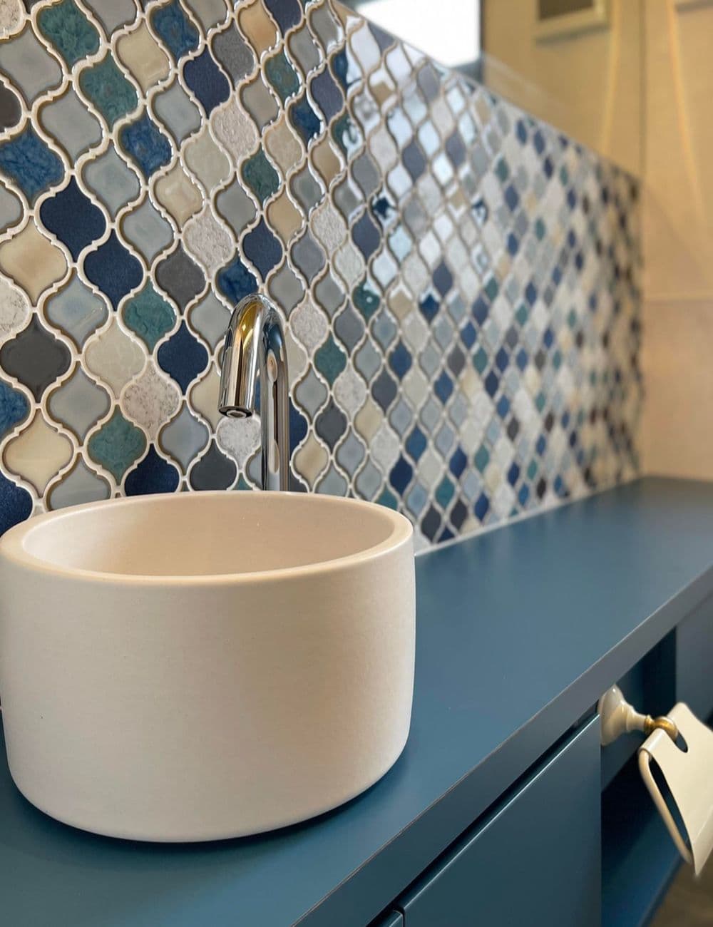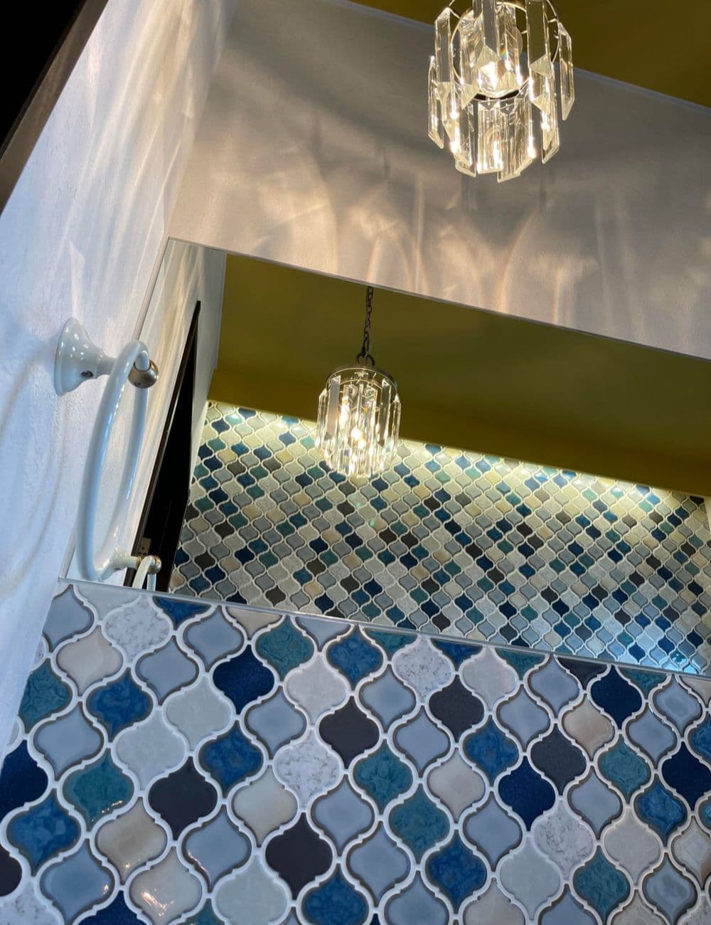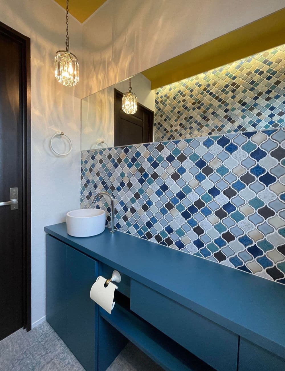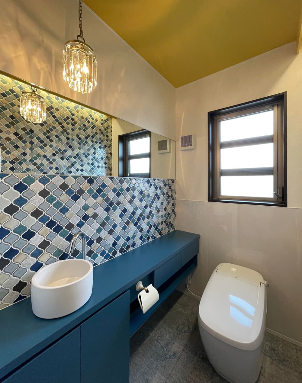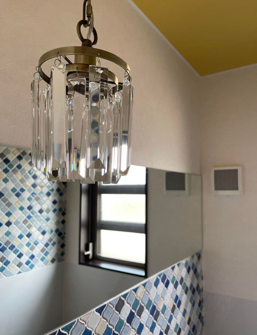 爽やかなブルー系のカラーでミックスした「コラベル」と手すりの形が波の動きを、クリスタルの照明が煌く陽射しを連想させ、そのコーディネートが見事に夏を表現した作品です。コメントにある通り、潮の香りが漂ってきそうな素敵なトイレ空間ですね。