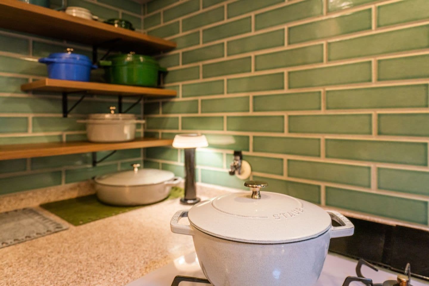 “食欲の秋”の言葉通りオータムカラーのタイル「アイグス」が、美味しい料理を作るキッチンのコーディネートに一役かっています。お気に入りの食器類とタイルの配色が素敵です。愛情たっぷりのかぼちゃのシチュー、温かくて美味しそうですね。