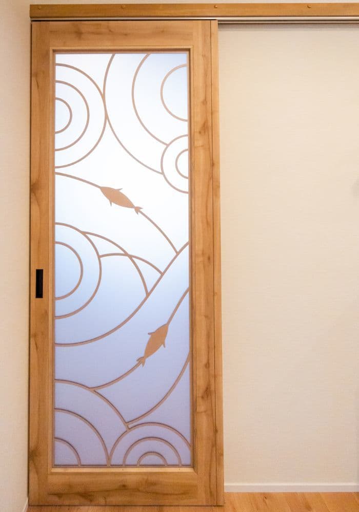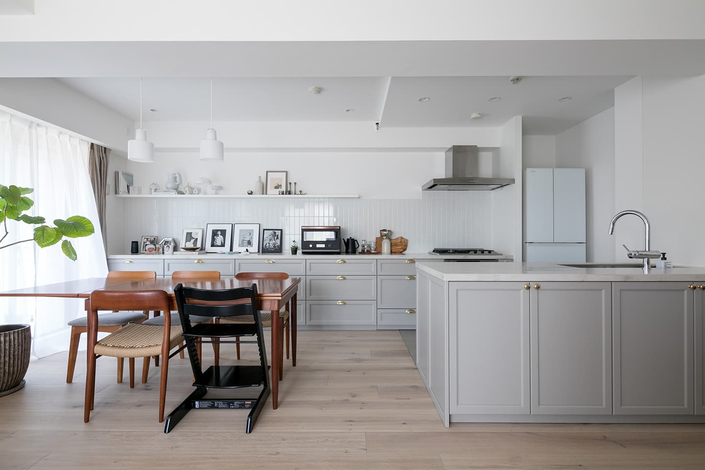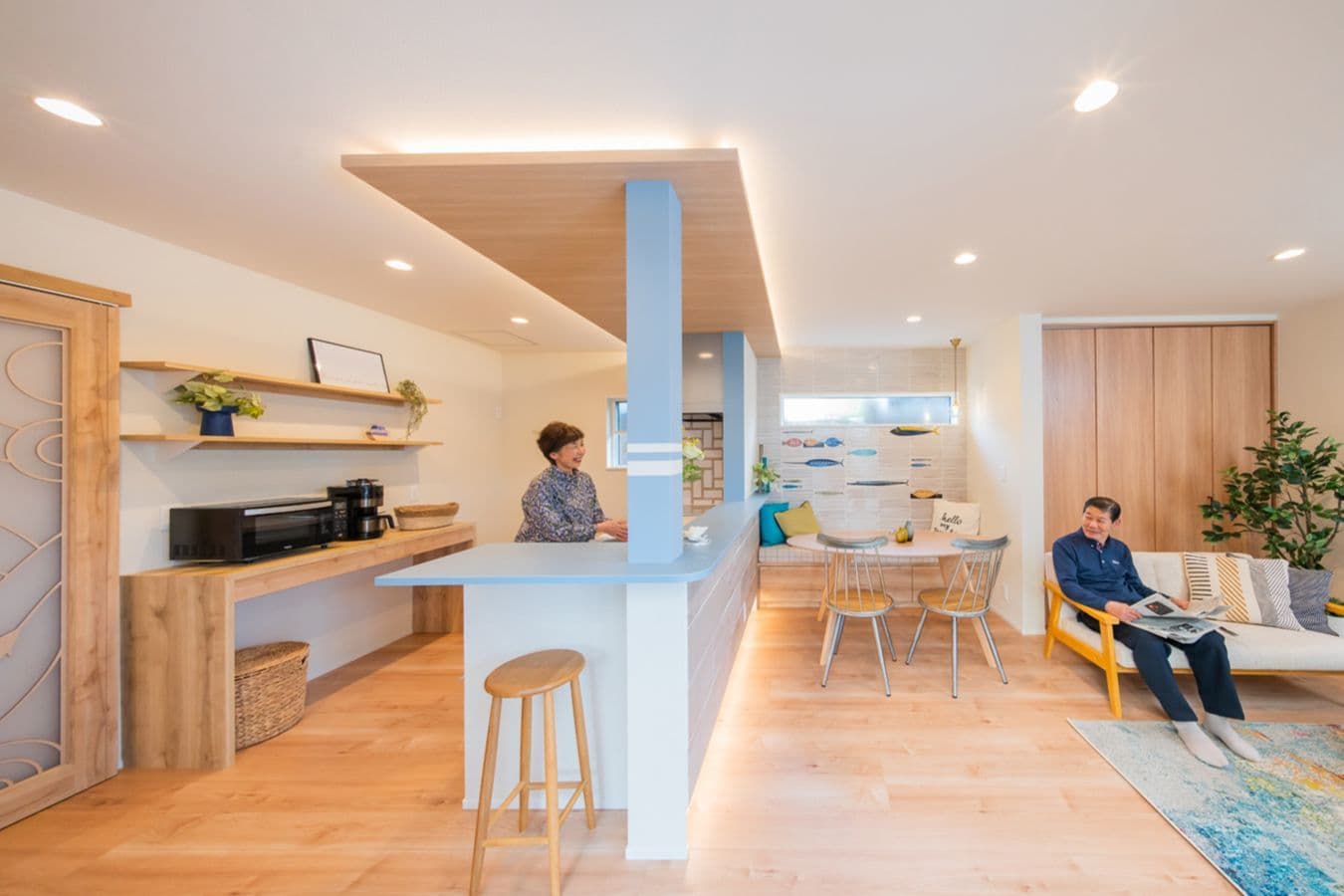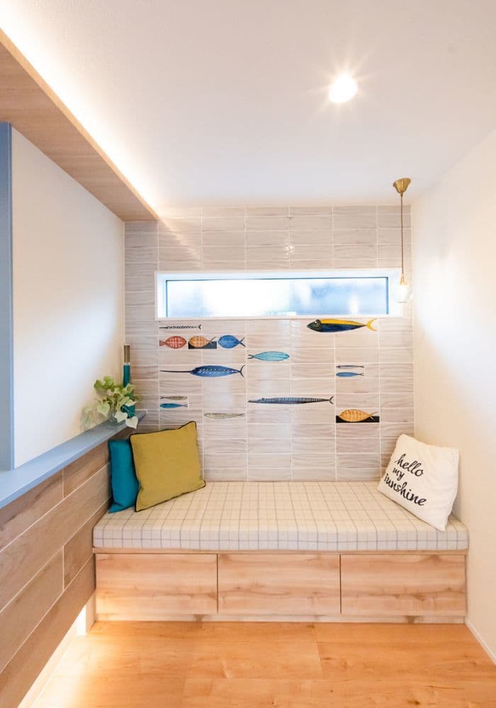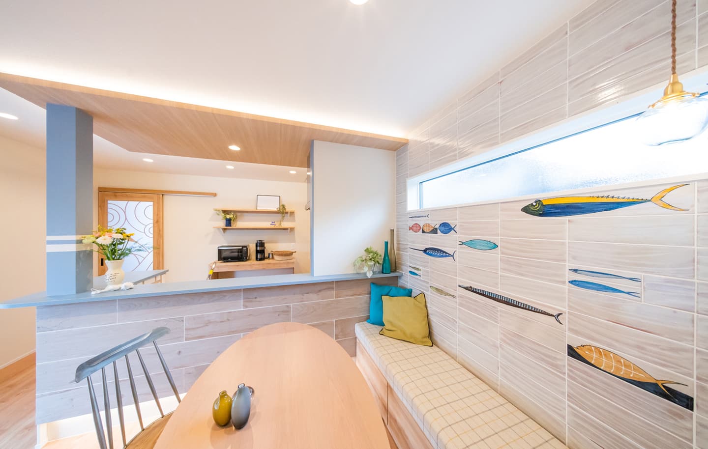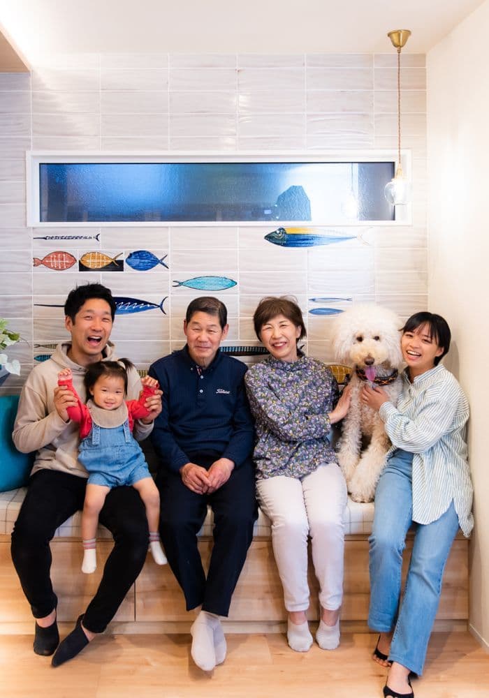 老舗鮮魚店のご家族にぴったりのお魚タイルが美しく配されたダイニングは、特別な空気感を醸し出し、絆やしあわせな雰囲気が伝わってきます。悠々と泳ぐ魚がデザインされた扉とのバランスも素敵です。ご家族団らんのスペースをパワーの源として何より大切にされている皆さまを思い、温かい気持ちになった作品です。