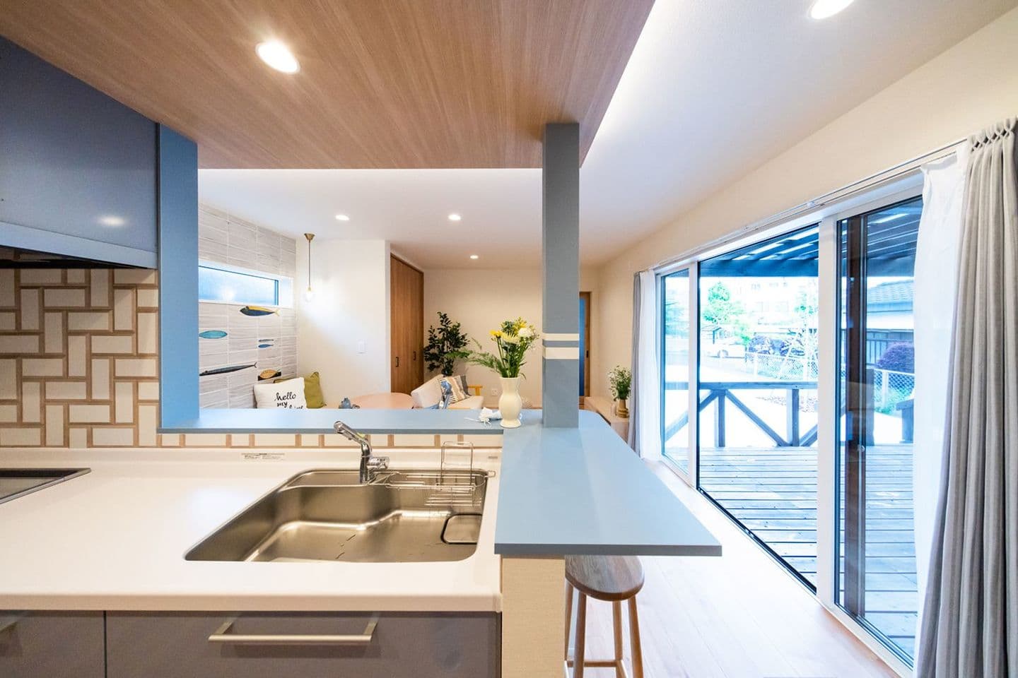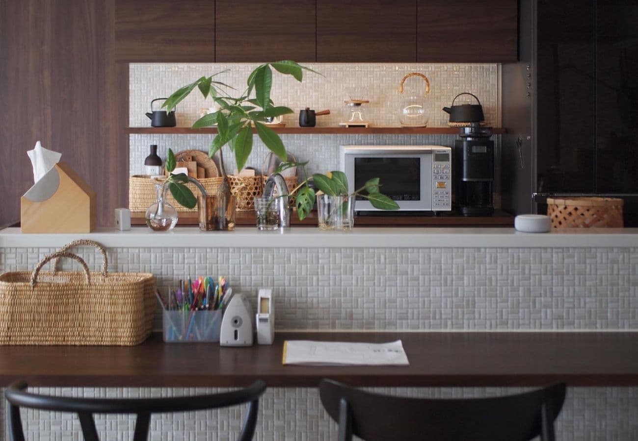 小料理屋さんのような素敵なコーディネートのキッチンカウンター。そこはまさに家族みんなを繋ぐ“パワースポット”。日々忙しい中でもコミュニケーションを大切するご家族の優しい時間が想像されます。