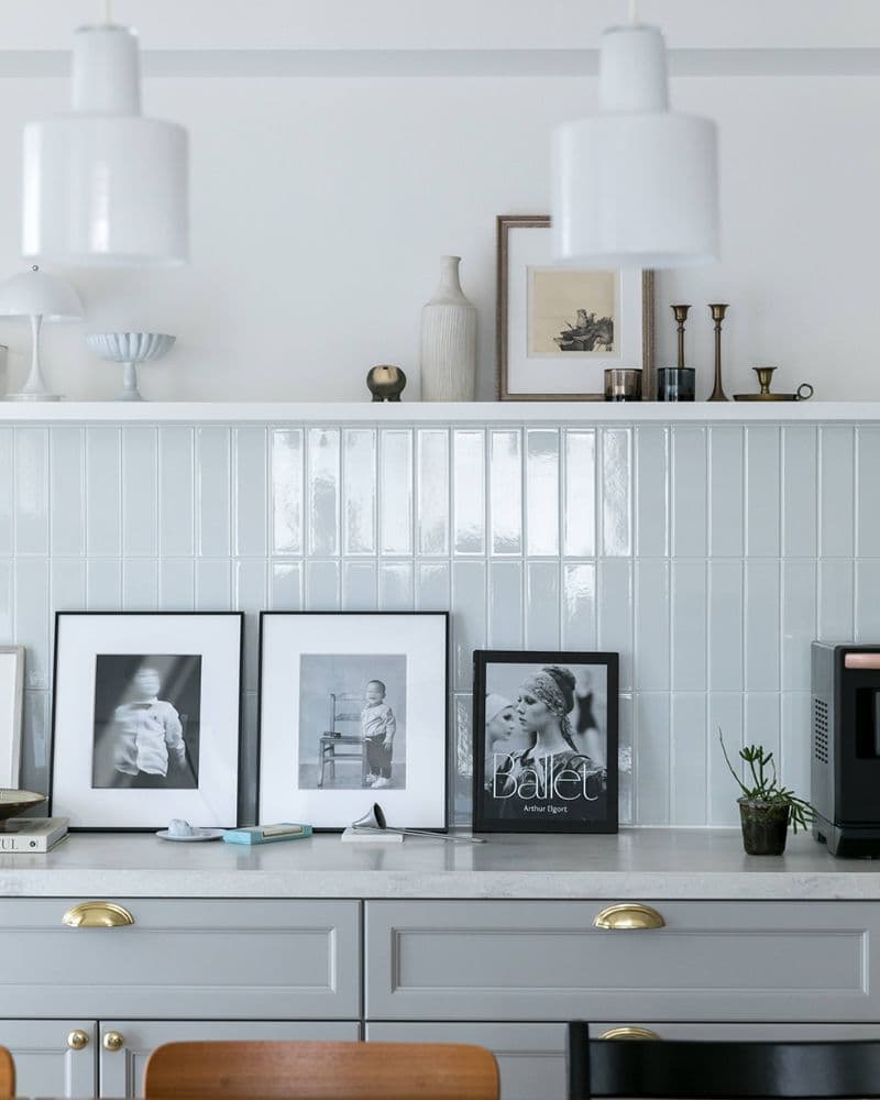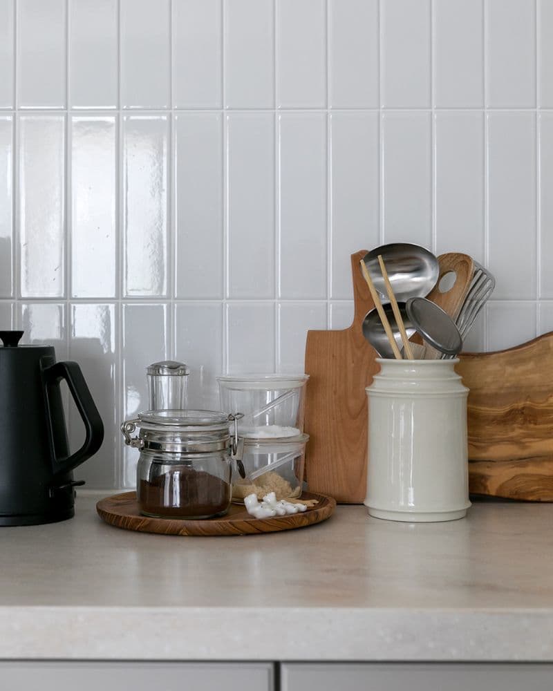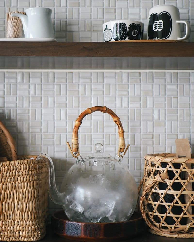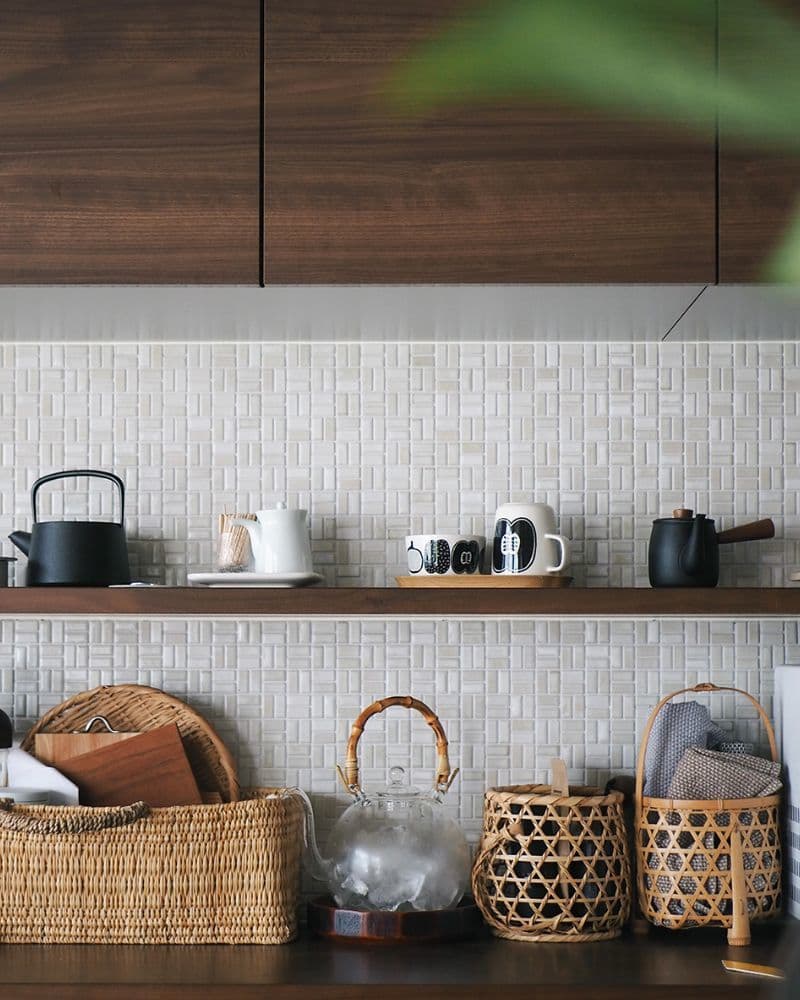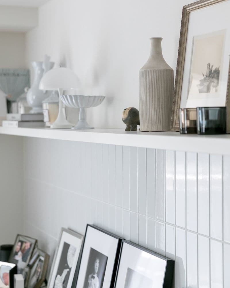 お気に入りの小物を引き立てるシンプルな白のタイル「ひだS」が、自然光を受けて艶やかな表情を見せています。ハイセンスなインテリアに囲まれ、気分の上がる瞬間が想像できる素敵な空間です。