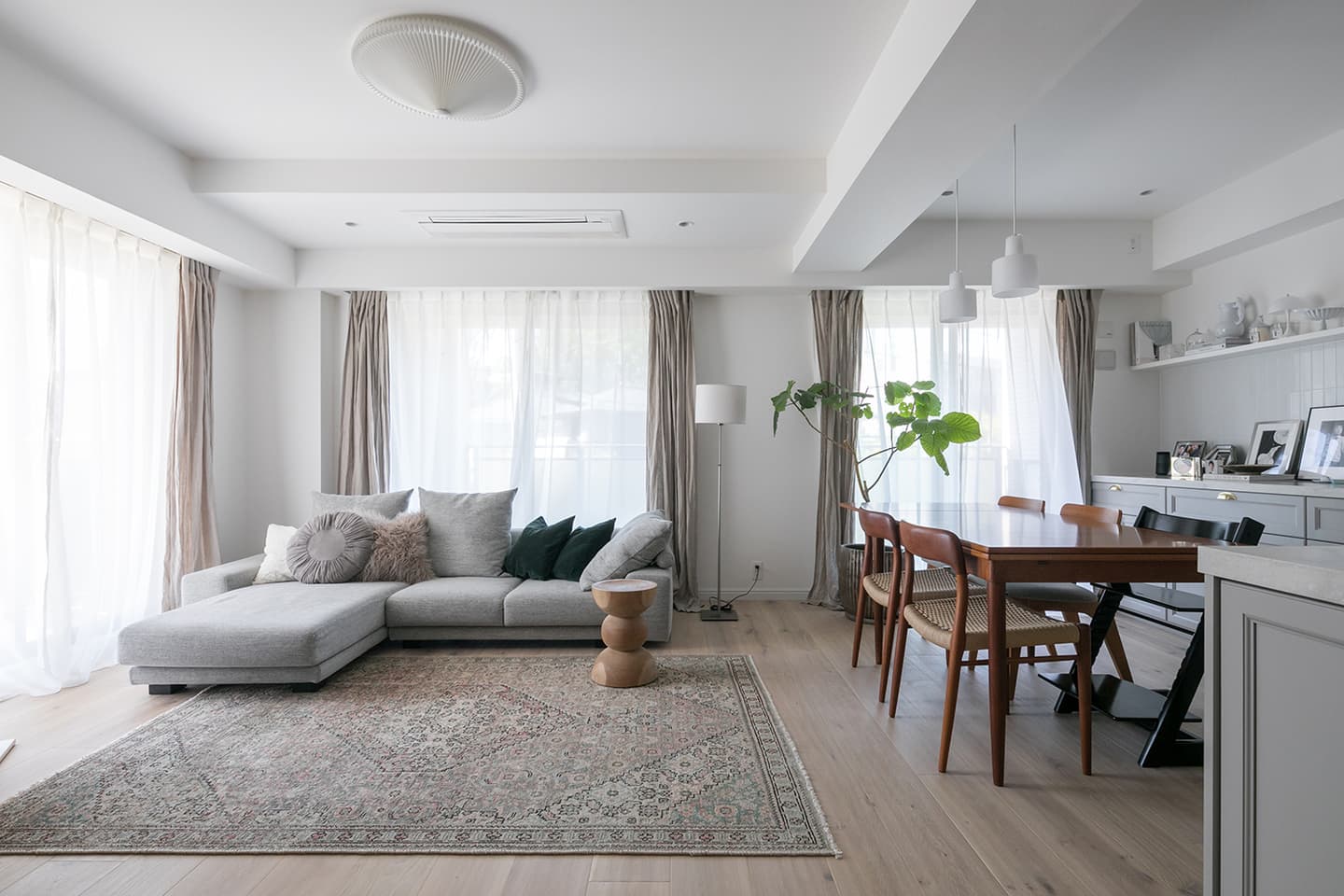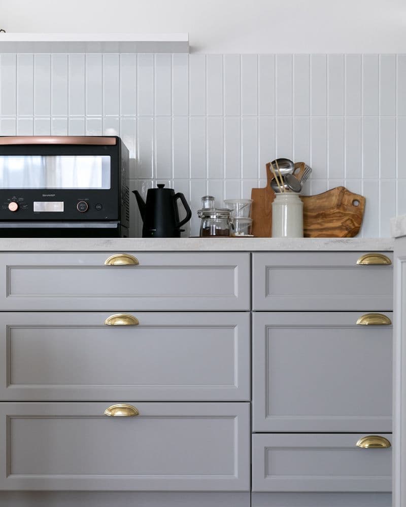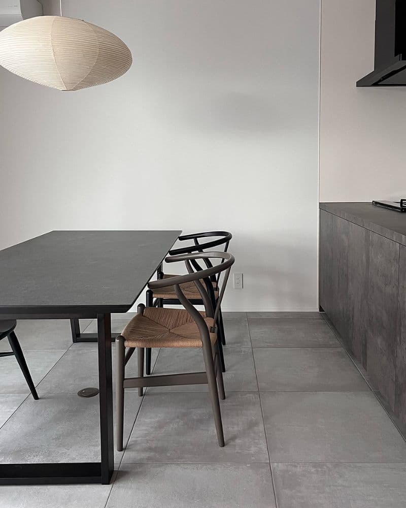 コンクリートの質感を忠実に再現した「コットメント」が、キッチン面材や家具と調和してクールです。赤ちゃんのいる暮らしの中で、メンテナンス面でもこのタイルが一役買っていることに感動です。