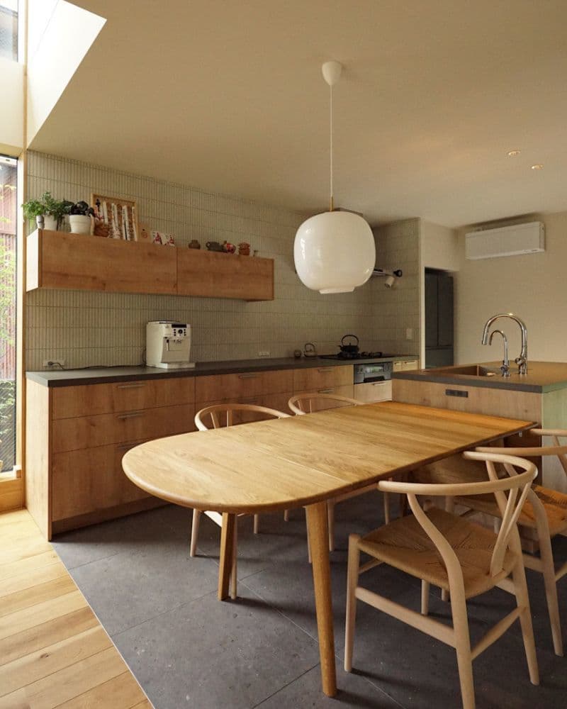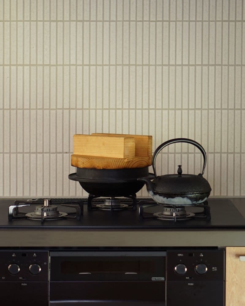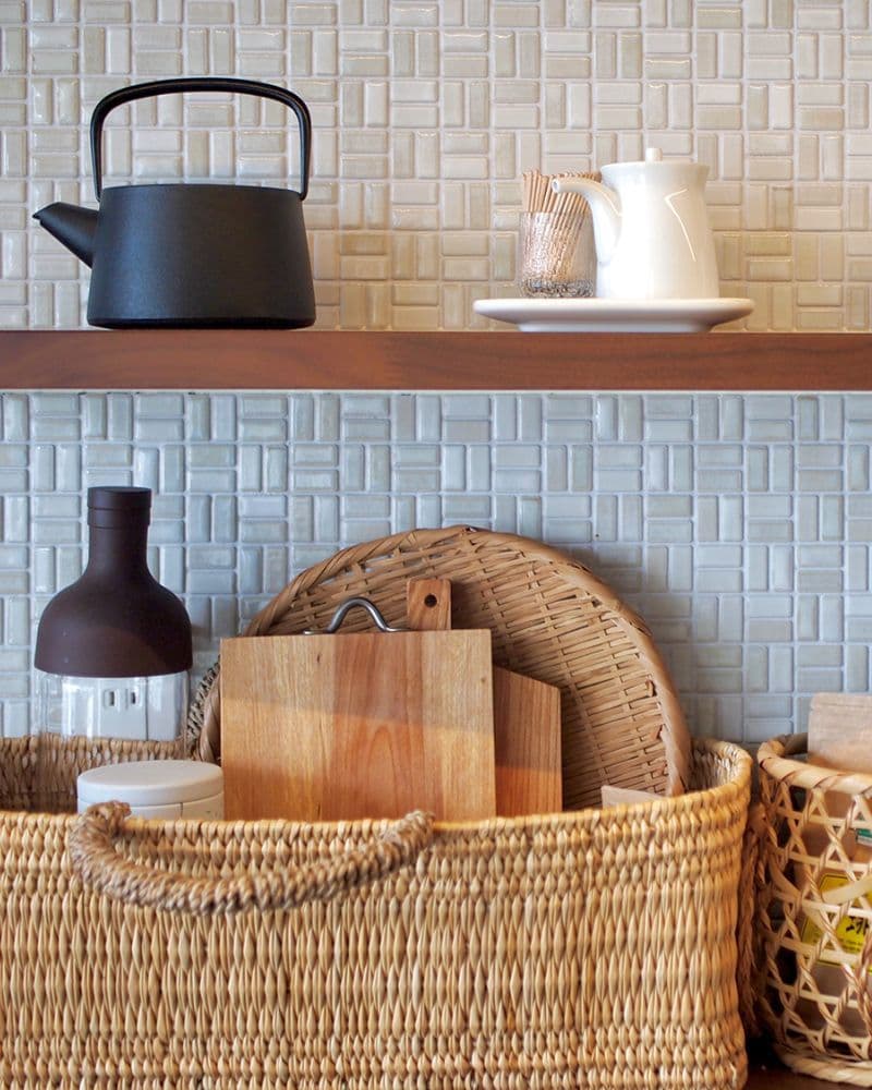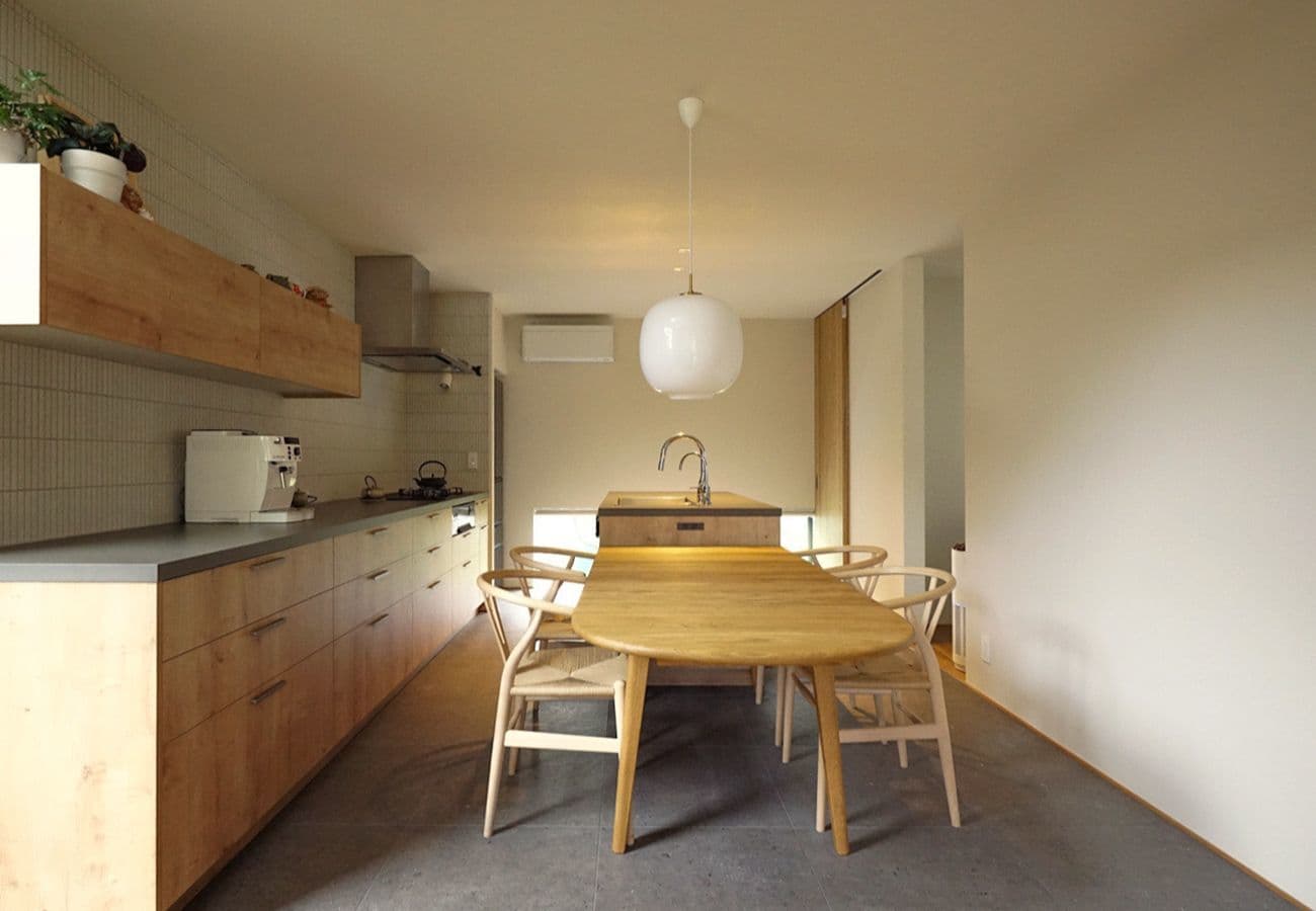 愛犬のシーサーくんを含むご家族みんなに“パワーチャージする場所”としてのキッチン。壁床のタイルと自然素材が美しく調和して、日々のエネルギーが湧き出てくるようなパワフルな空間です。