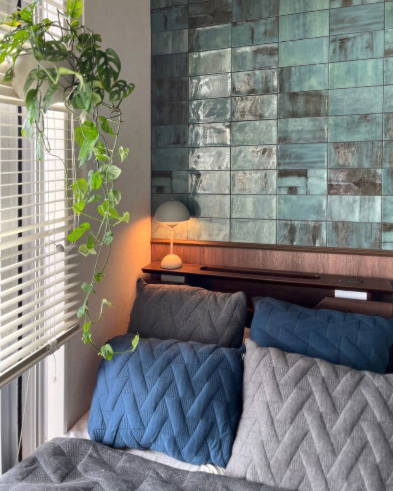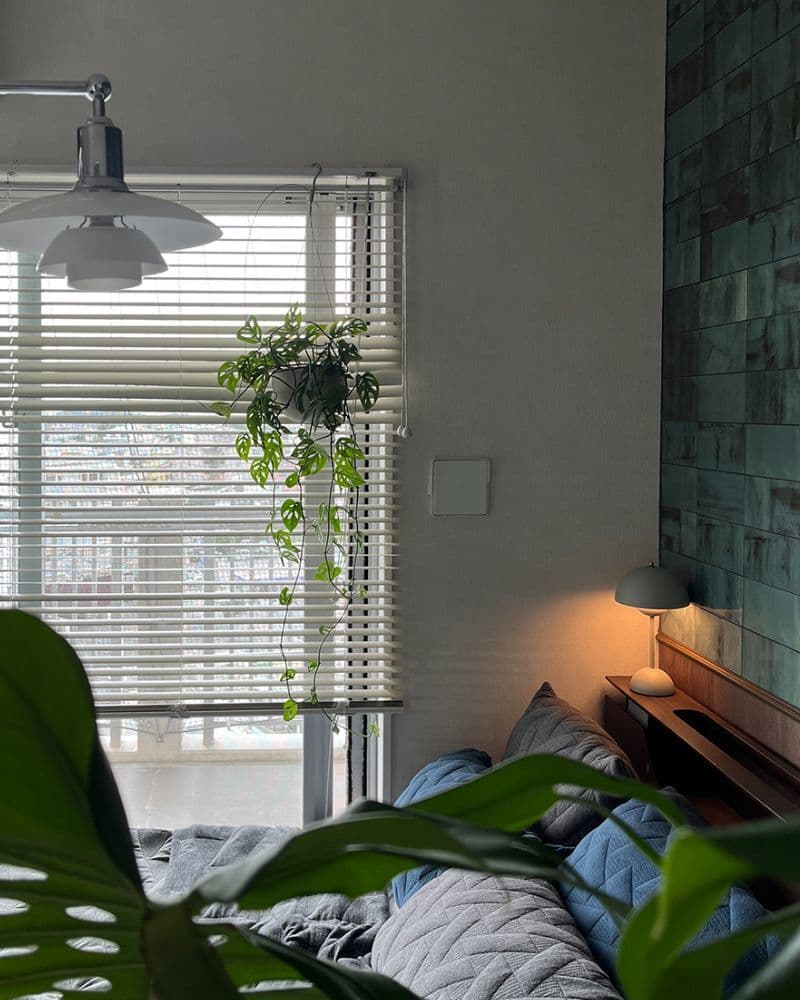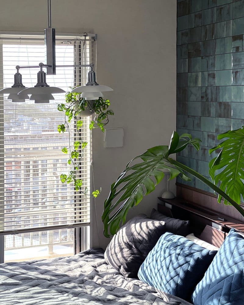 コンパクトな寝室だからこそ思い切って取り入れたグリーンの「ボルサーリ」が、観葉植物やベッドリネンの質感・色合いとマッチして海外の邸宅のような趣です。勇気を出してご採用頂き本当に良かったです。