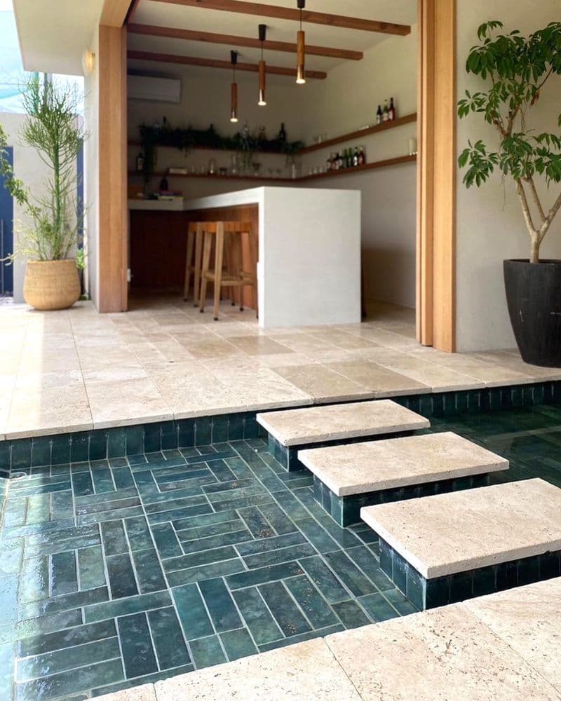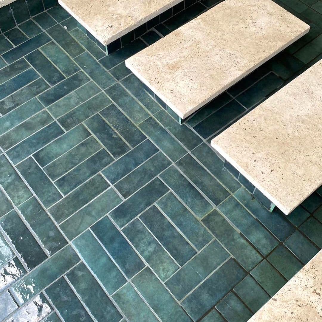 鮮やかで焼きものらしい色幅のある「バーガンディ」のグリーンを、水の波紋を思わせるユニークな張りパターンでご採用頂きました。“水面を渡ることで日々の疲れをリセットし心をトリートメントする空間”というコンセプトが強く伝わってきます。