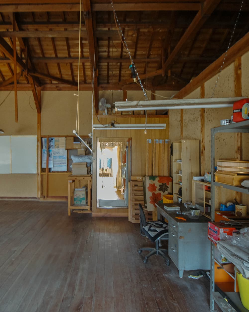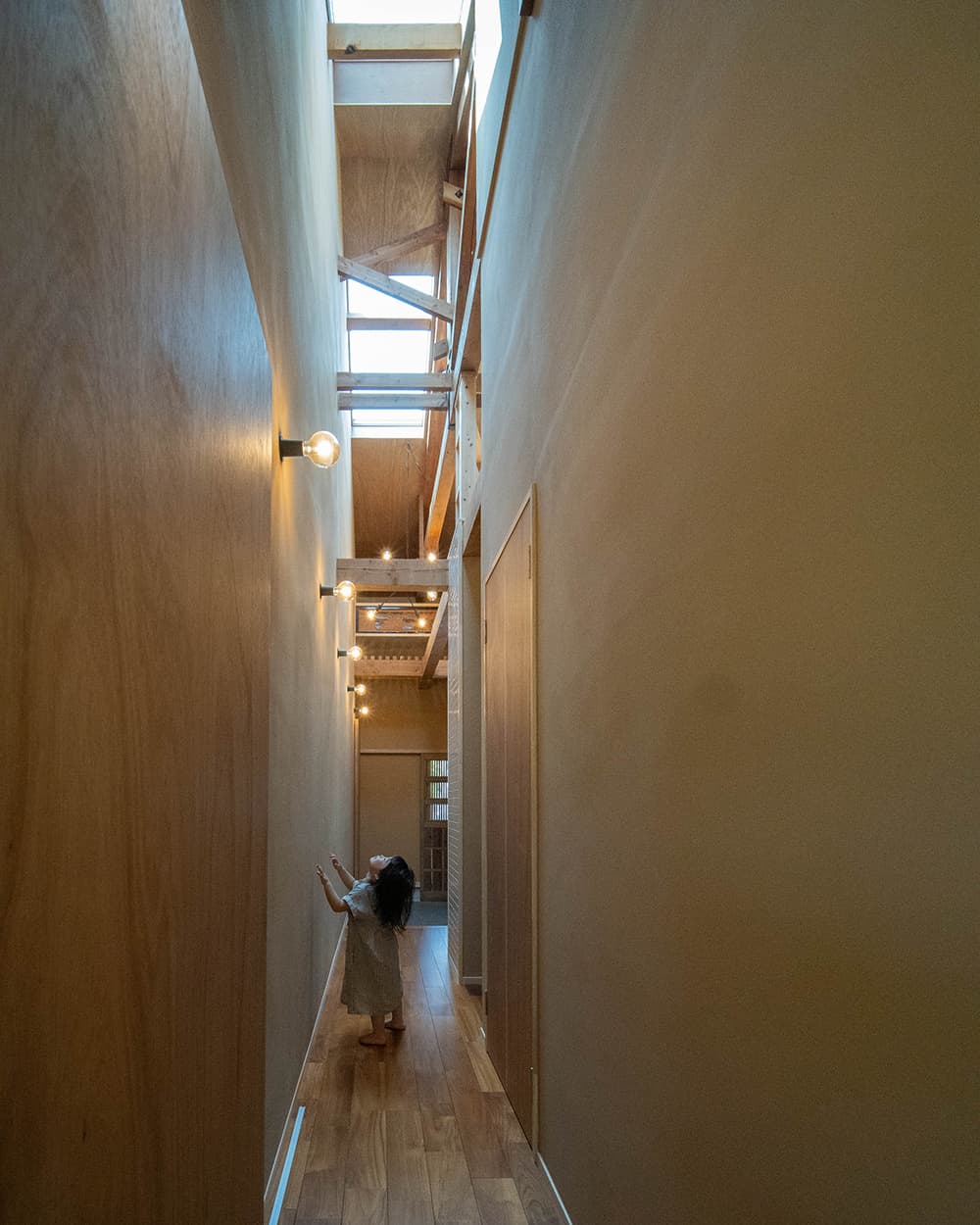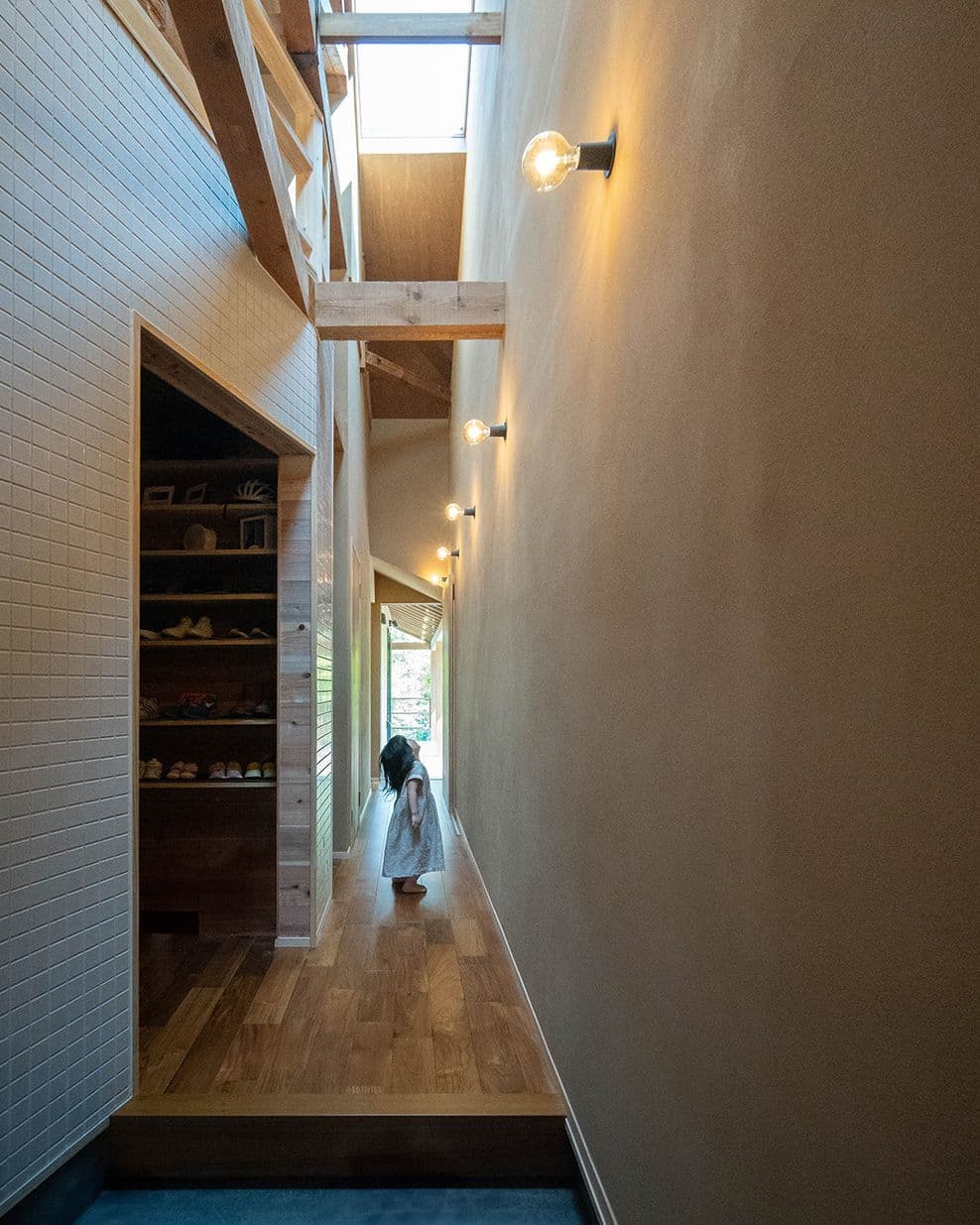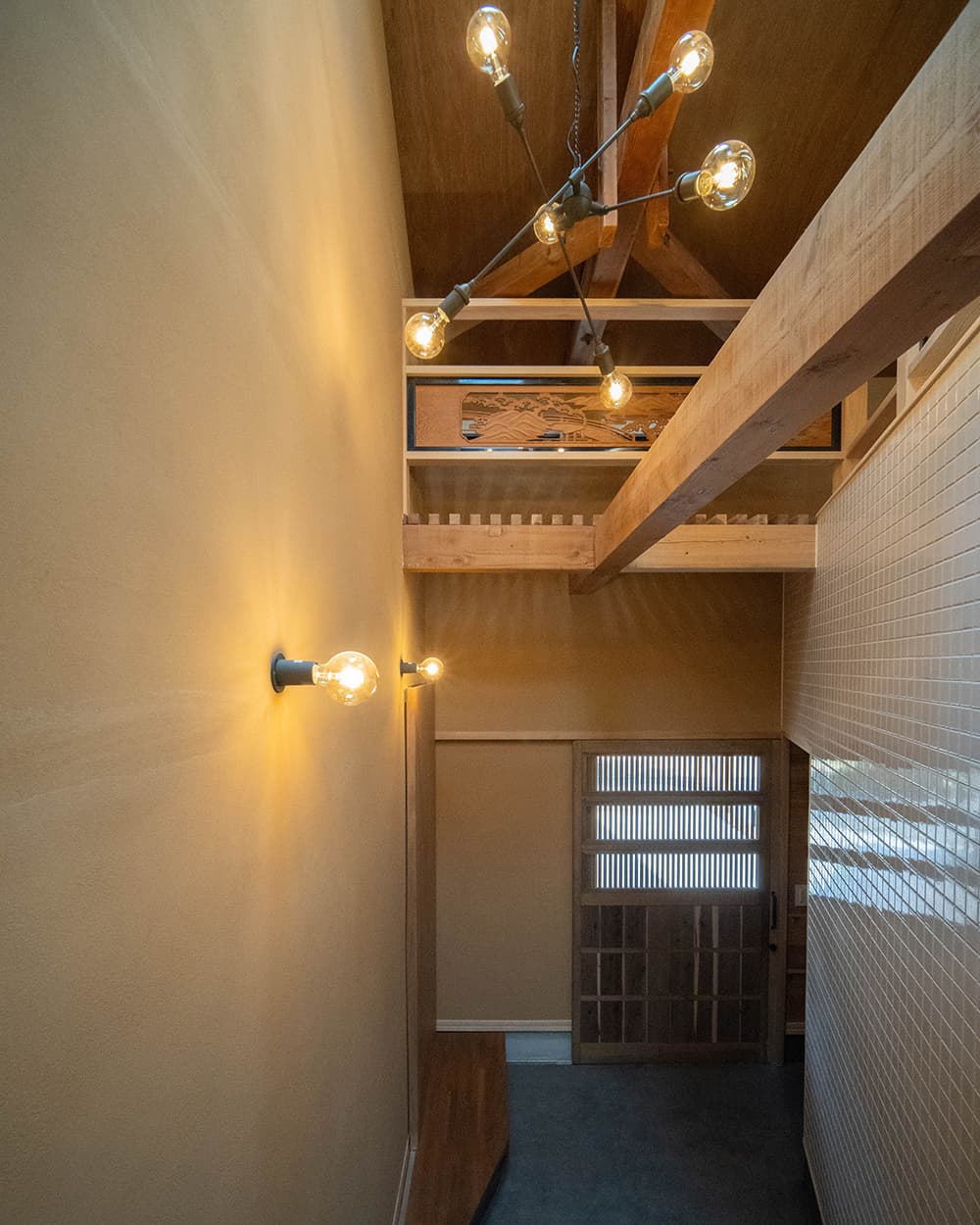 かつて隠居と機織工場だった建物をリノベーションした住まい。工場時代の木梁を活かした構造の中で、シンプルなタイル「クラール」と優しい土色の壁が溶け合い、心地よい空間を生み出しています。開放的な天井を見上げるお孫さんの愛らしい姿が、素敵な玄関空間の“たたずまい”を象徴する作品です。