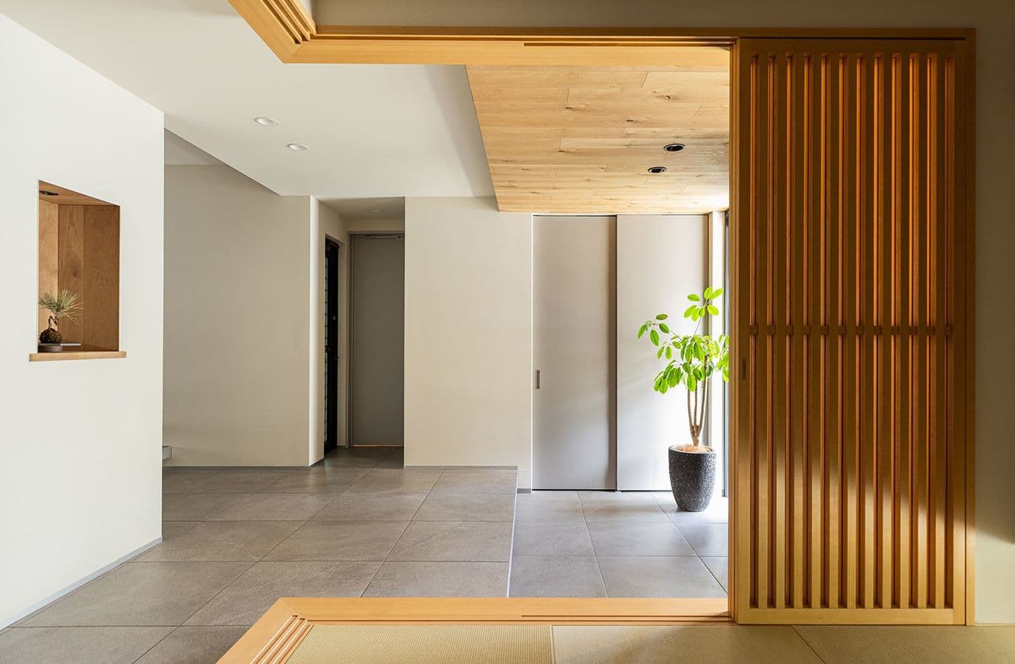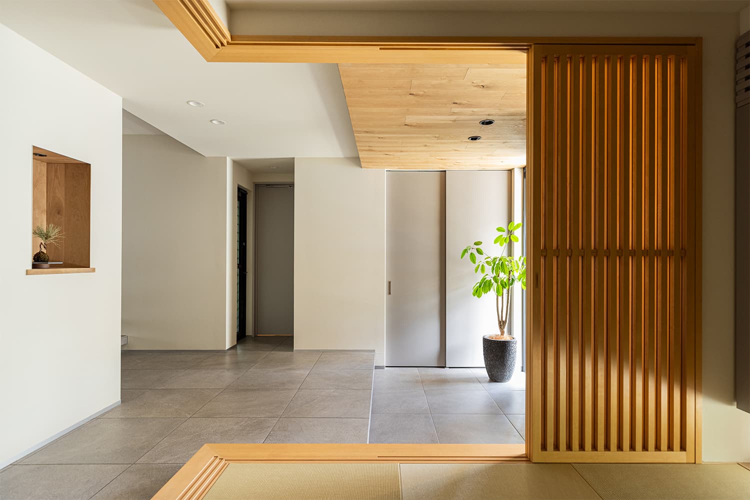 木の温もりと畳の静けさに、上品な石目模様の「チューニングストン」が溶け込む和モダンの玄関ホール。格子戸と観葉植物が彩りを添える、奥行きと清涼感をまとった洗練の“たたずまい”がひときわ注目を集めました。