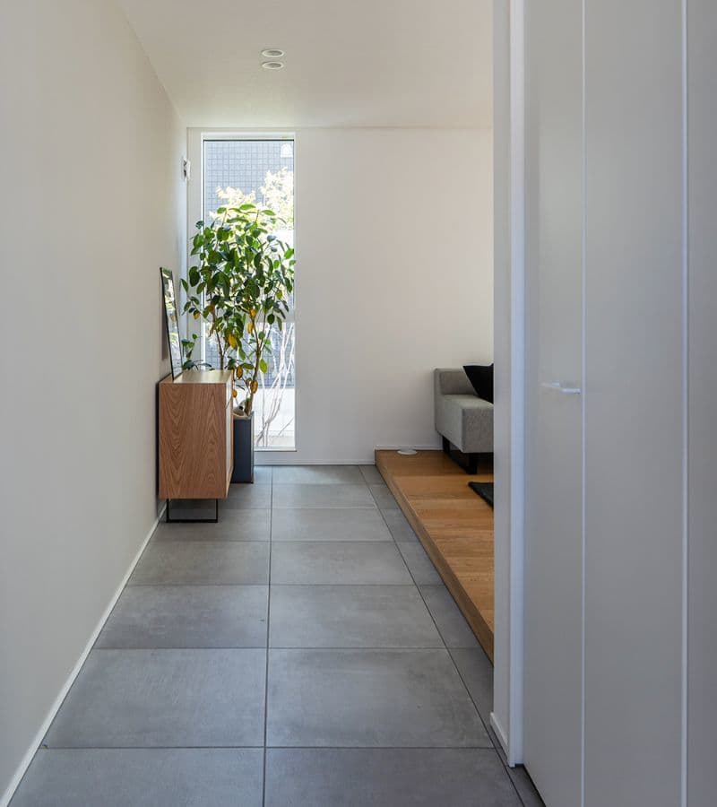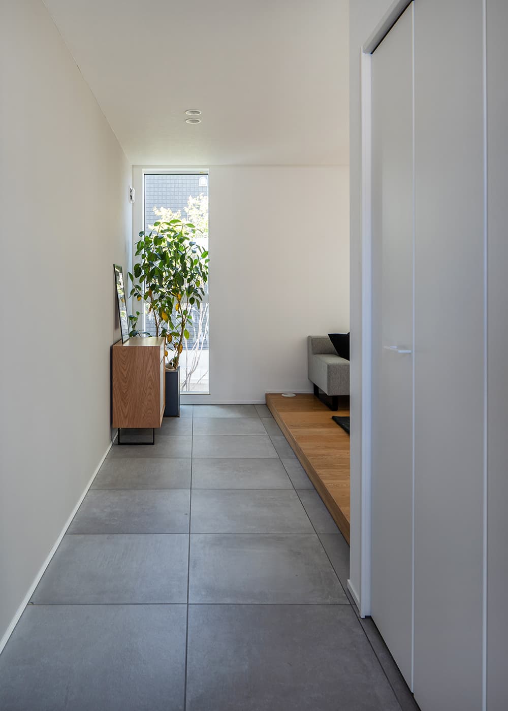 セメント調タイル「コットメント」と木目の調和が美しい開放的な玄関空間。大きな窓から差し込む光によって変化するタイルの表情も魅力的です。ついつい話が弾んでしまいそうな居心地のよい空間ですね!